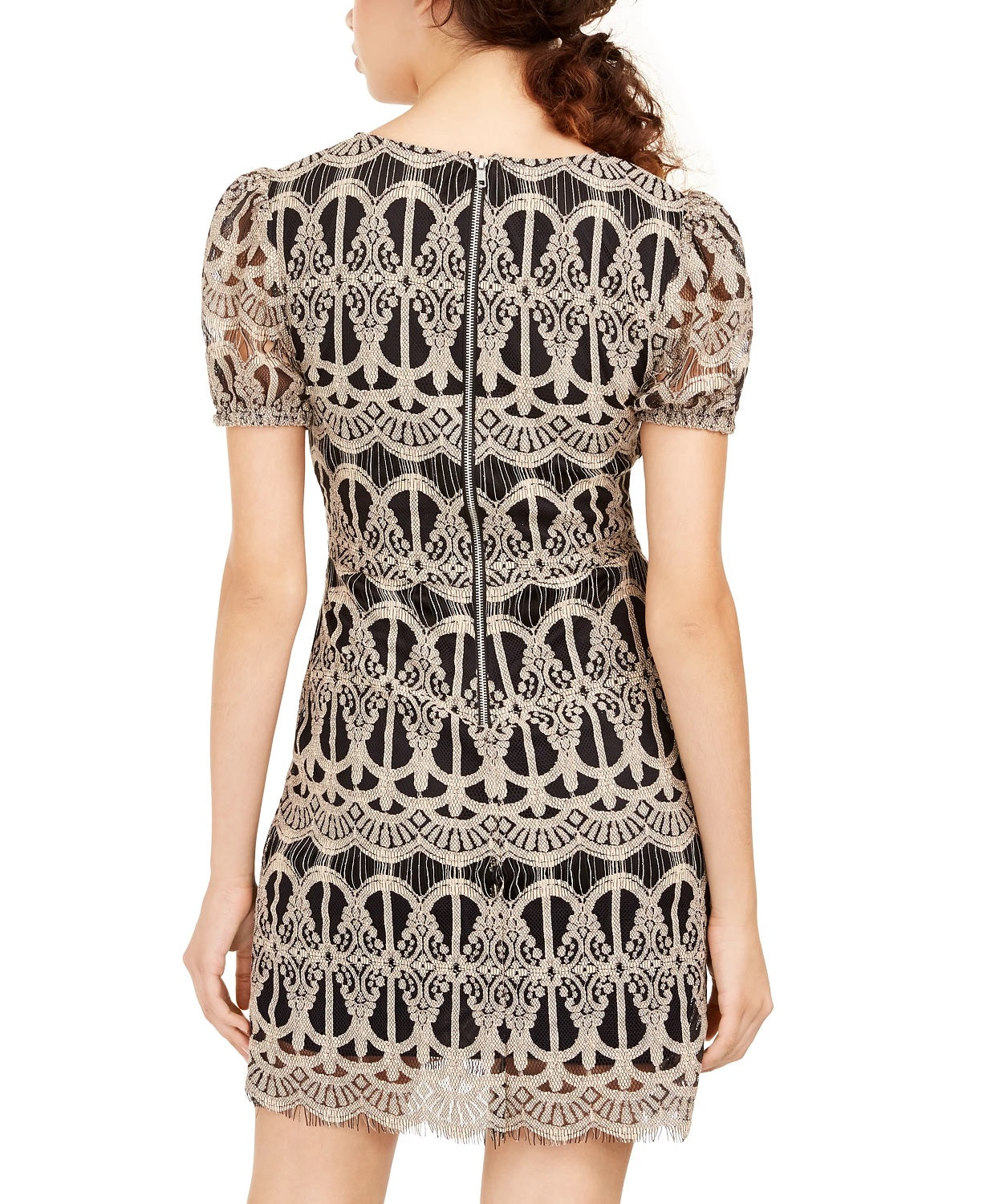 Approx. 32-1/2" long from center back neck to hem. Length varies 5/8" between sizes|Round neckline; Bodycon silhouette|Back zipper closure|Allover lace; elastic at sleeves; crochet inset at waist; scalloped hem|Shell: cotton/nylon; lining: polyester