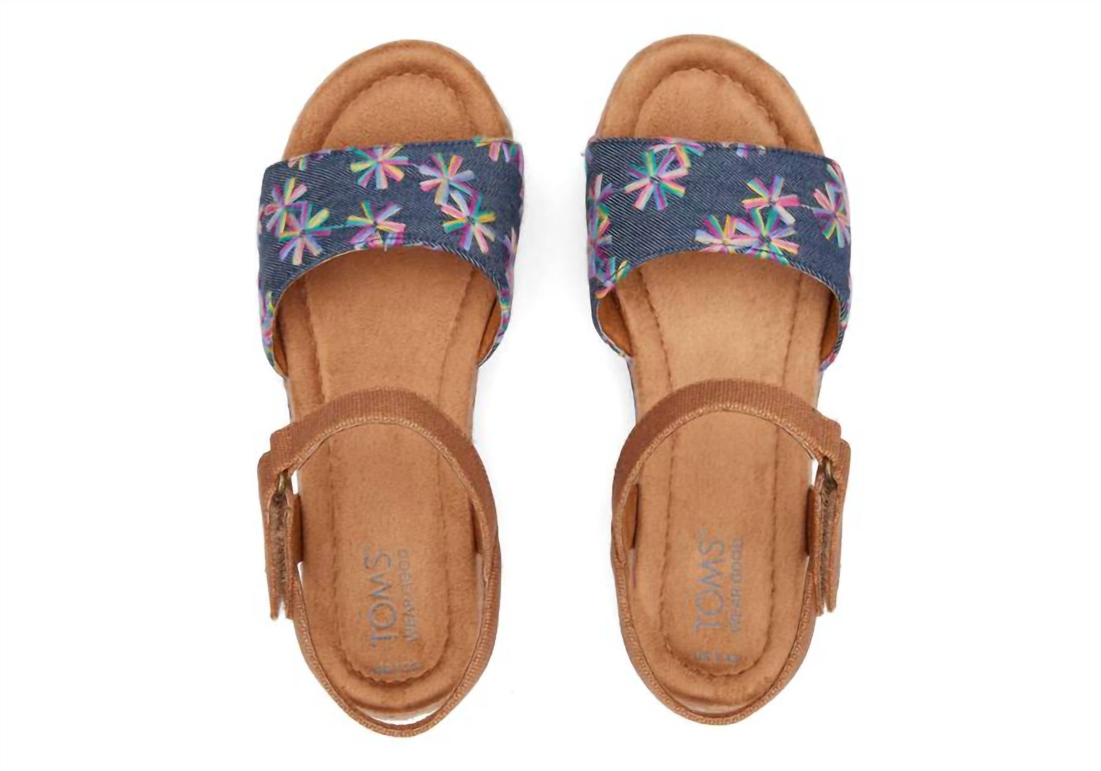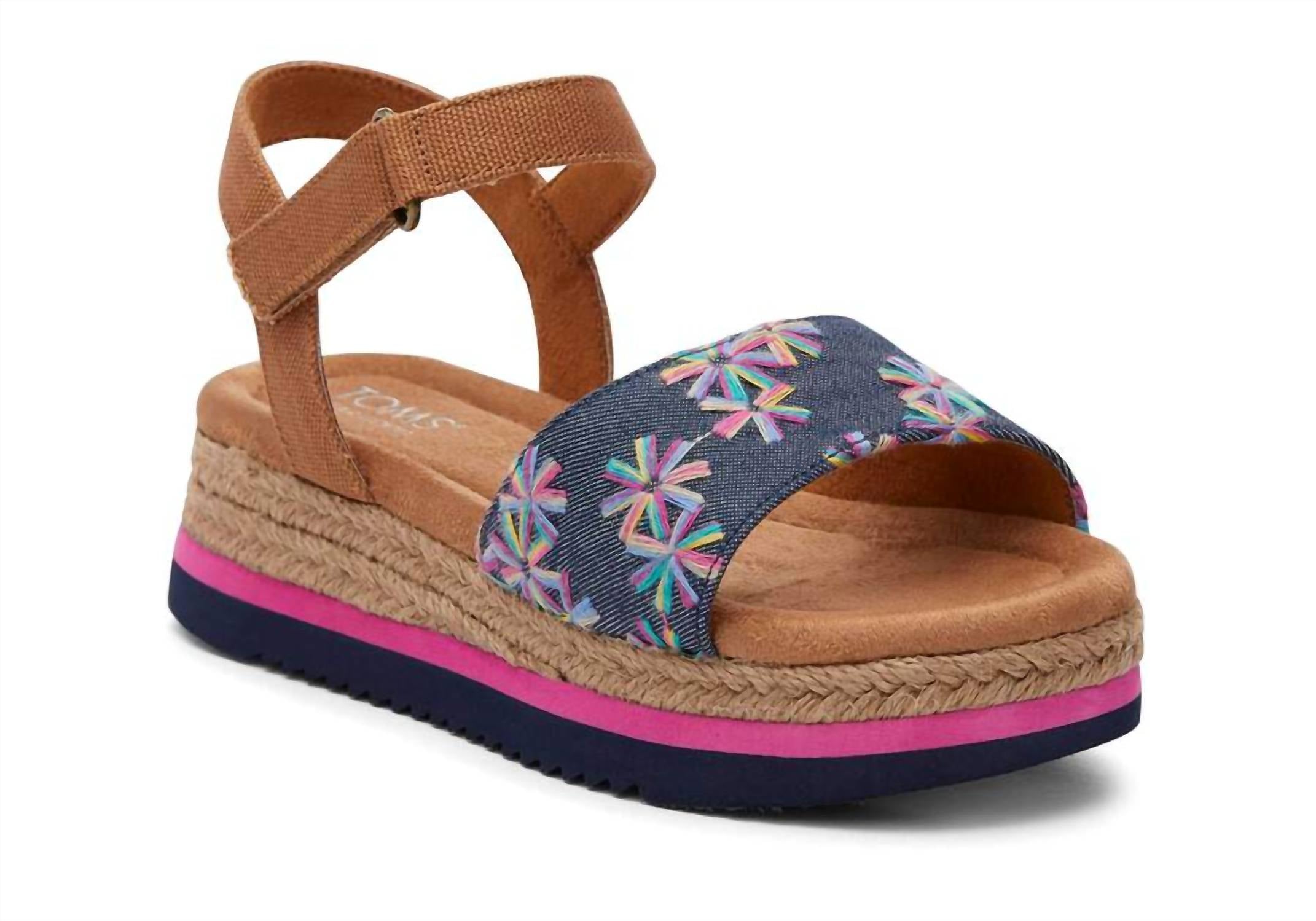 This Kids Girls Diana Sandal features a yarn-dyed textile upper and a 1.25” low wedge heel. The EVA outsole with a sawtooth rubber bottom offers extra traction, while the OrthoLite Eco X40-Hybrid insole provides cushioned support. The rope-wrapped lightweight midsole adds coastal flair, and the adjustable hook-and-loop ankle strap ensures a snug fit. Ideal for summer adventures.