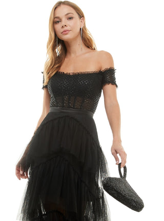 City Studios Junior's Off The Shoulder Tiered Mesh Gown Black Size 9