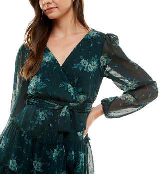 City Studios Junior's Surplice Neck Metallic Fit & Flare Dress Green Size Medium
