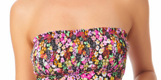 California Waves Junior's Smocked Bandeau Tankini Top Swimsuit Black Multi Size Small