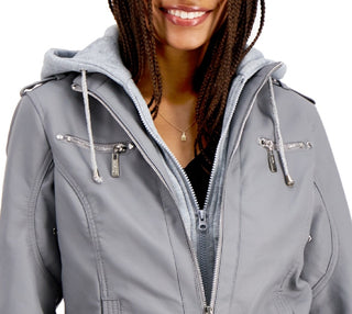 Jou Jou Junior's Hooded Faux Leather Moto Jacket Gray Size X-Large