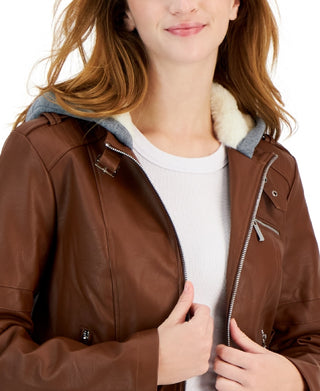 Jou Jou Junior's Faux Leather Hoodie Moto Jacket Brown Size Medium