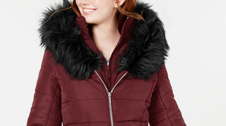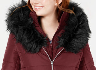 Maralyn & Me Juniors' Hooded Faux-Fur-Trim Puffer Coat Wine Size Medium