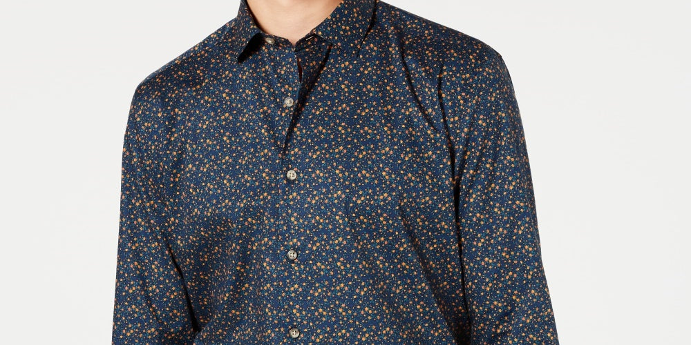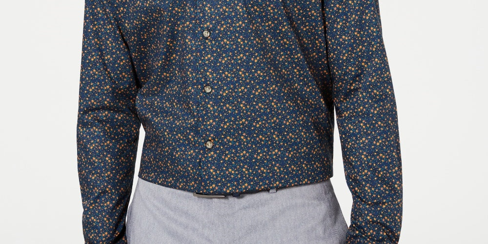 Bar III Men's Navy Easy Care Patterned Collared Slim Fit Cotton Dress Shirt Blue Size 16.5X32-33