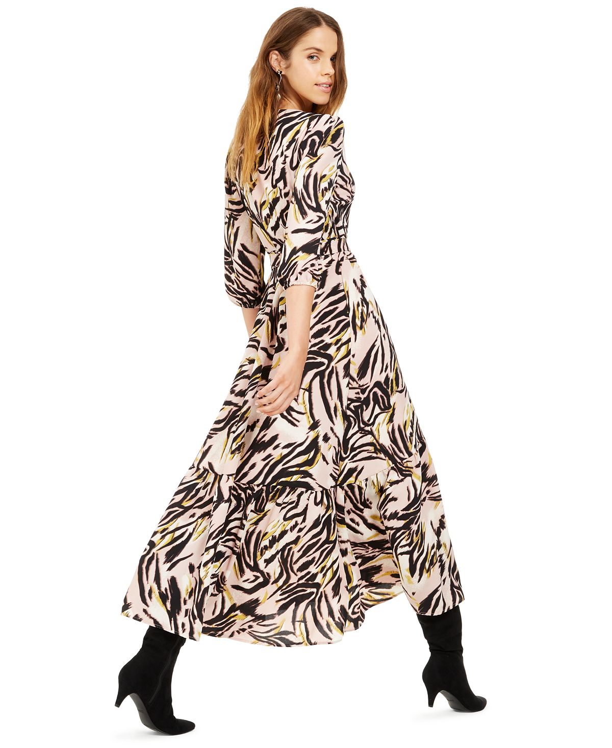 Bar III kicks it up a notch with this flowy wrap dress| showcasing a bold print and fun| flouncy hemline. | Surplice neckline; A-line silhouette| Wrap design with tie closure| 3/4-sleeves; cinched cuffs