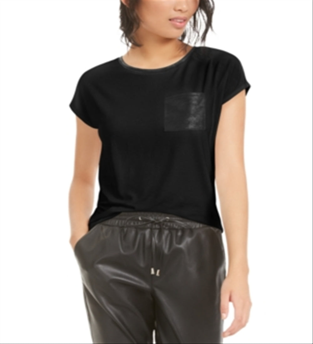 Add edgy vibes with this chic T-shirt from Bar III| styled with faux-leather accents to elevate your look.| Approx. 22-1/2 long| Crew neckline with faux-leather trim; partial back zipper closure| Faux-leather pocket at chest