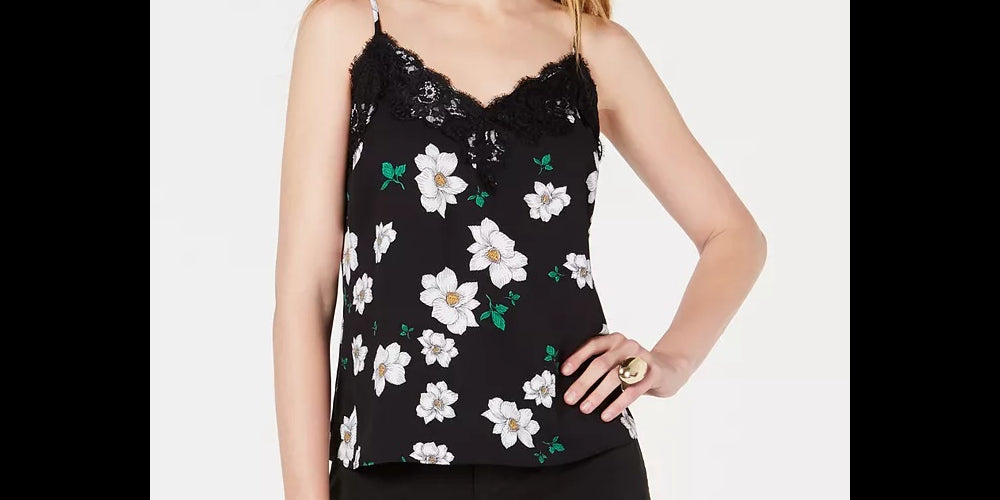 Hits at hip; approx. 19" long|V-neck|Eyelash lace at neckline|Adjustable spaghetti straps|Polyester