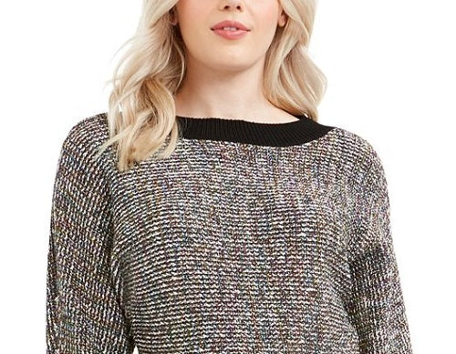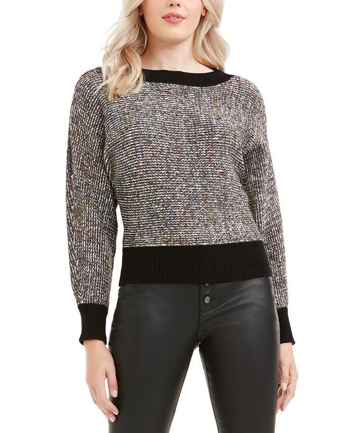 Shine of the times; metallic and marled| Bar III's dolman-sleeve sweater glows with contemporary coziness and bold contrast ribbed trim.| Relaxed fit; approx. 20-3/8 long| Boat neckline with contrast ribbed trim| Contrast ribbed hemline band| Dolman long sleeves with contrast ribbed cuffs
