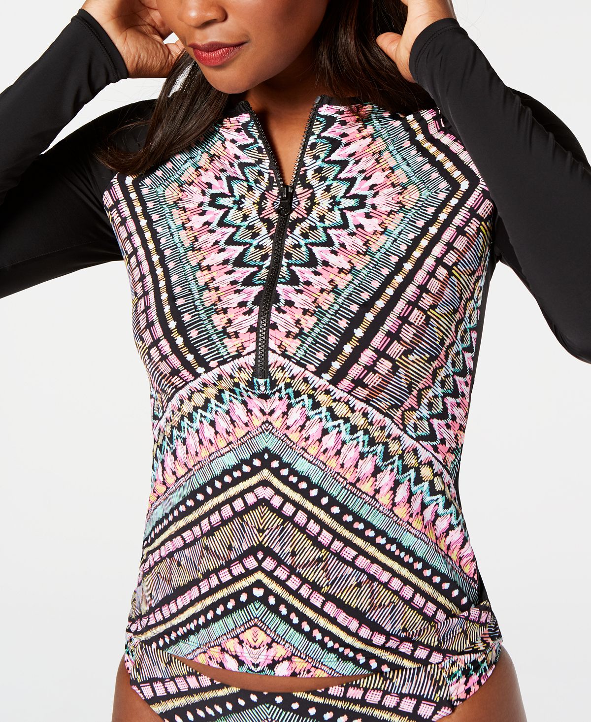 Keep your swim look sporty and sleek with this stylish long-sleeve rash guard from Bar III| finished with a vibrant abstract print and a front zipper for an adjustable neckline.| Hits at hips| Pull on with half-zip closure| Unlined| | Nylon/elastane