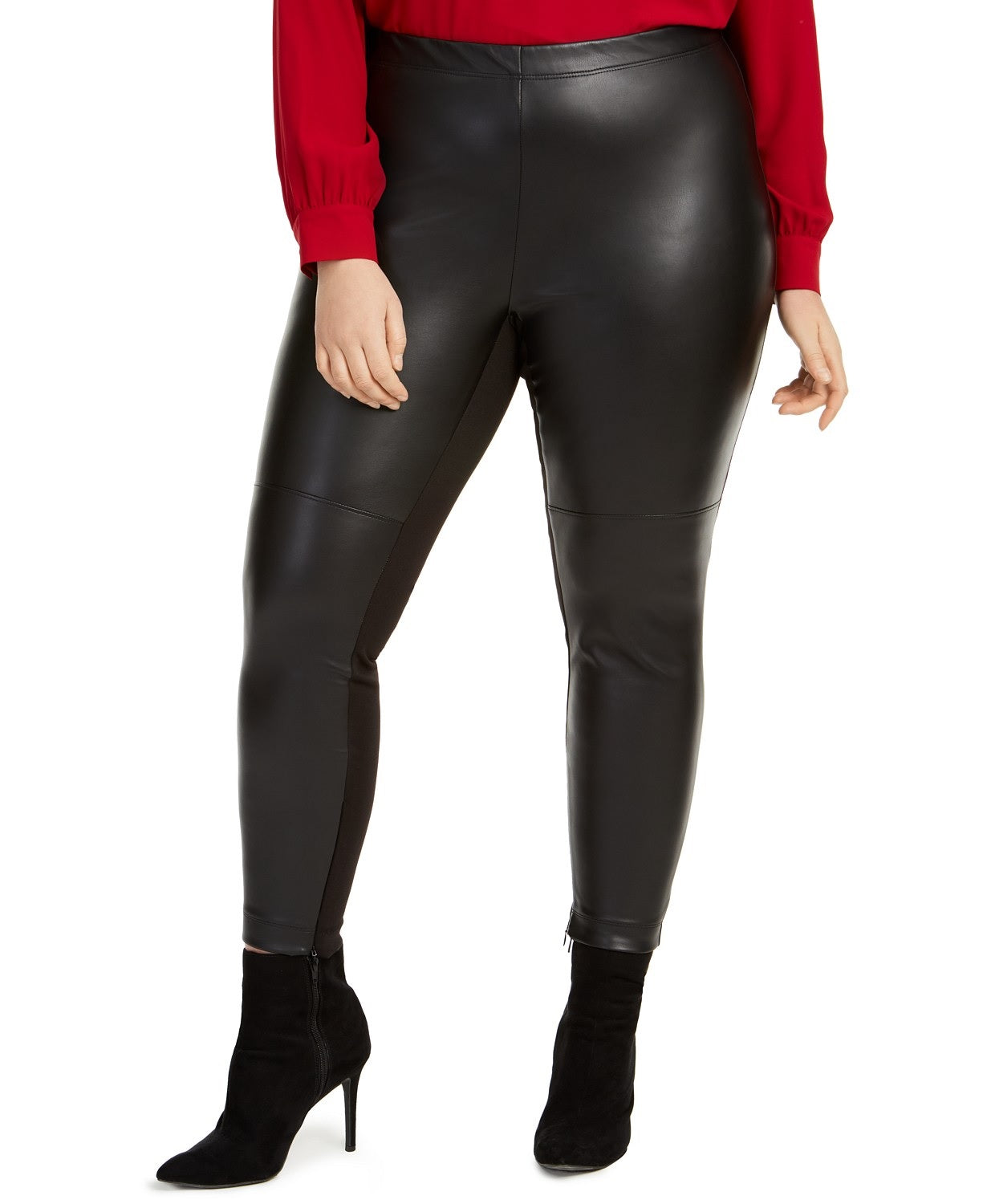 Approx. model height is 5'10" and she is wearing a size 1X|Approx. inseam: 28"|Mid rise; slim fit through hips and thighs; skinny leg|Pull-on styling|Faux-leather front; ponté-knit back; zippers at cuffs|Front: polyurethane; back: polyester