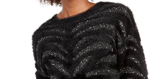 Bar III Women's Black Sequined Animal Print Long Sleeve Jewel Neck Sweater Black Size Small