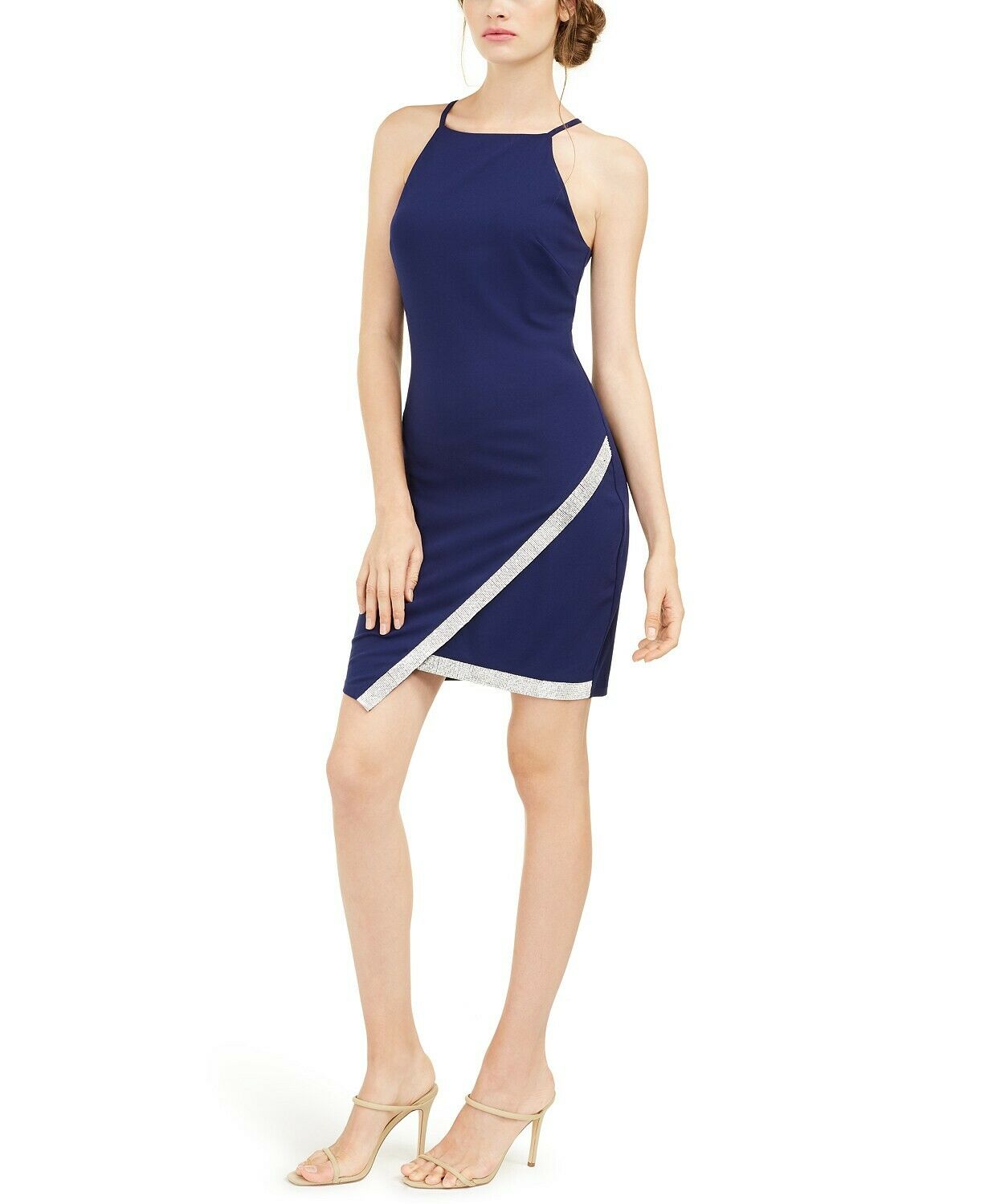 Keyhole and button closure at back|Halter neckline; Bodycon silhouette|A wrapped envelope hem is the focal point on this alluring bodycon dress|Halter neckline; Bodycon silhouette