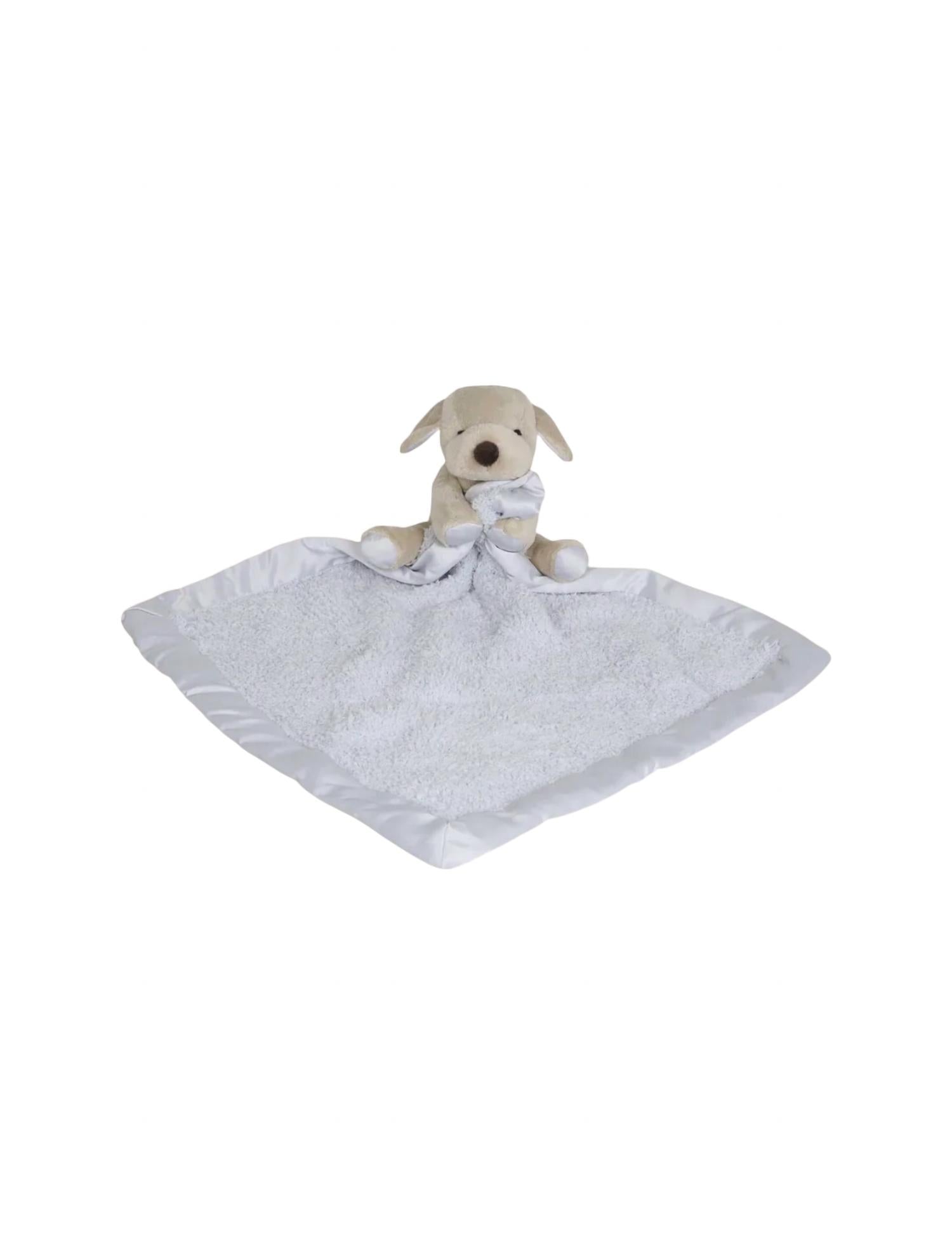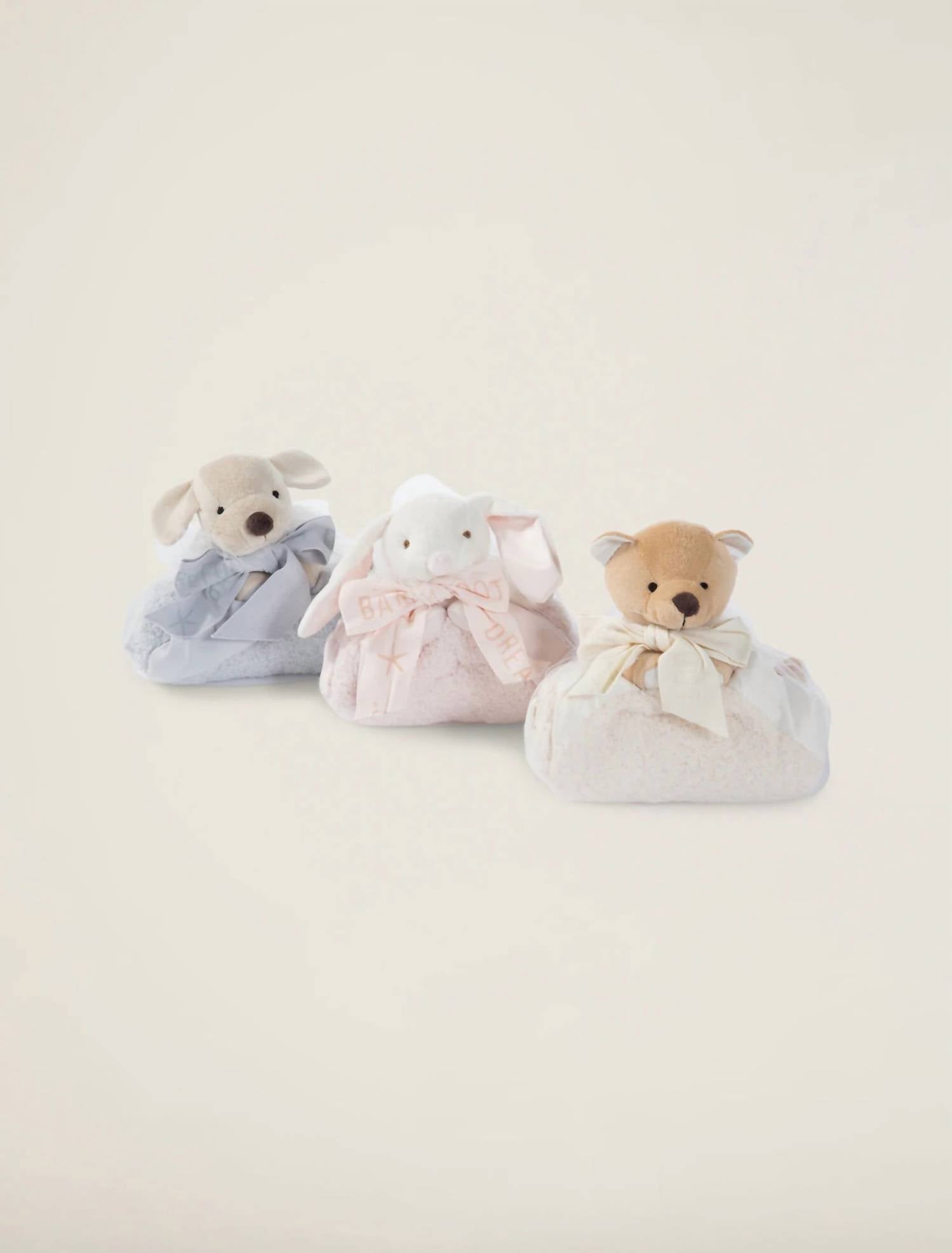 This product includes adorable buddy attached to a Barefoot Dreams CozyChic Knit™ blanket, featuring luxurious satin trim. The blanket is made of 100% polyester microfiber, while the trim is 100% satin. The buddy is filled with polyester fiber and pellets. For cleaning, machine wash cold on a gentle cycle and lay flat or tumble dry on low; avoid bleach, dryer sheets, or fabric softener. Measures 15" x 17".