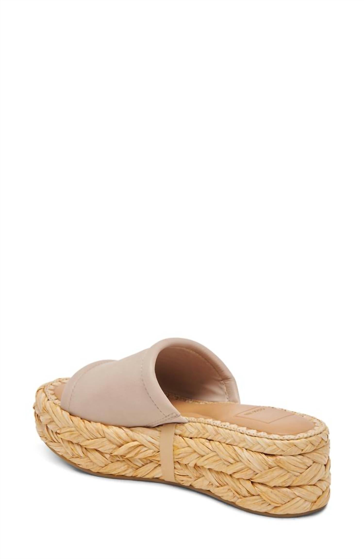 A woven platform sole brings sunny-day vibes to this versatile slide sandal that will quickly soar to essentials status with its easy-on design. 2" heel; 1 1/2" platform; 1/2" slope (size 8.5) Leather or textile upper/recycled textile lining/synthetic sole