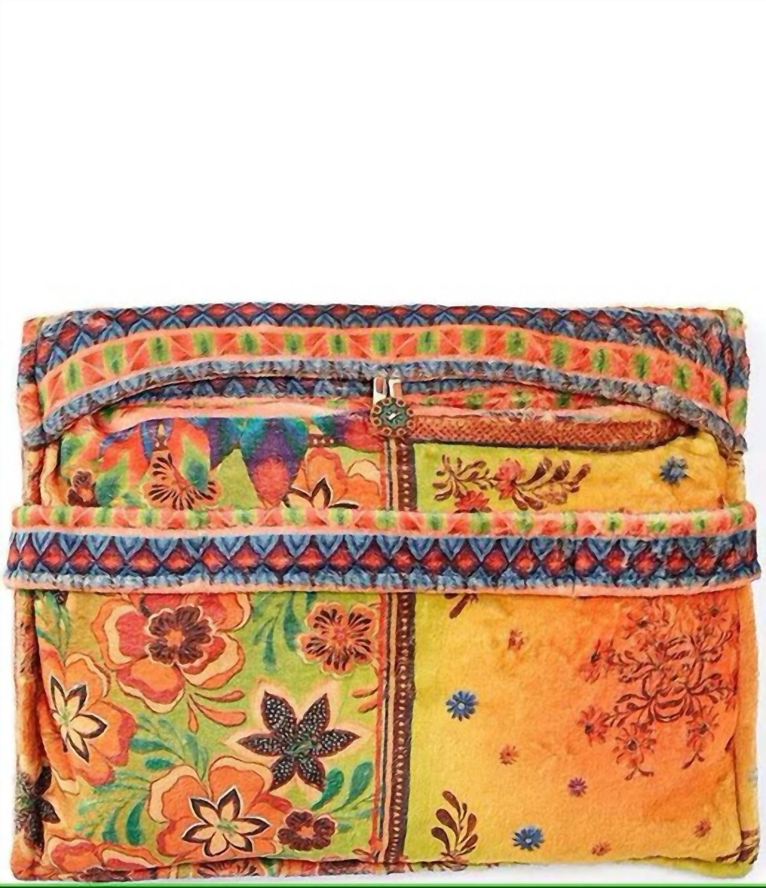 The Tiedye Travel Blanket is a beautifully designed, packable blanket adorned with bold colors and vibrant floral patterns. It features two unique designs and is fully reversible. This lightweight blanket can be easily folded into its attached pocket for convenient storage. It’s a great addition to your travel carry-on or beach tote. Measurements: 68" x 53" 100% Polyester Machine Wash