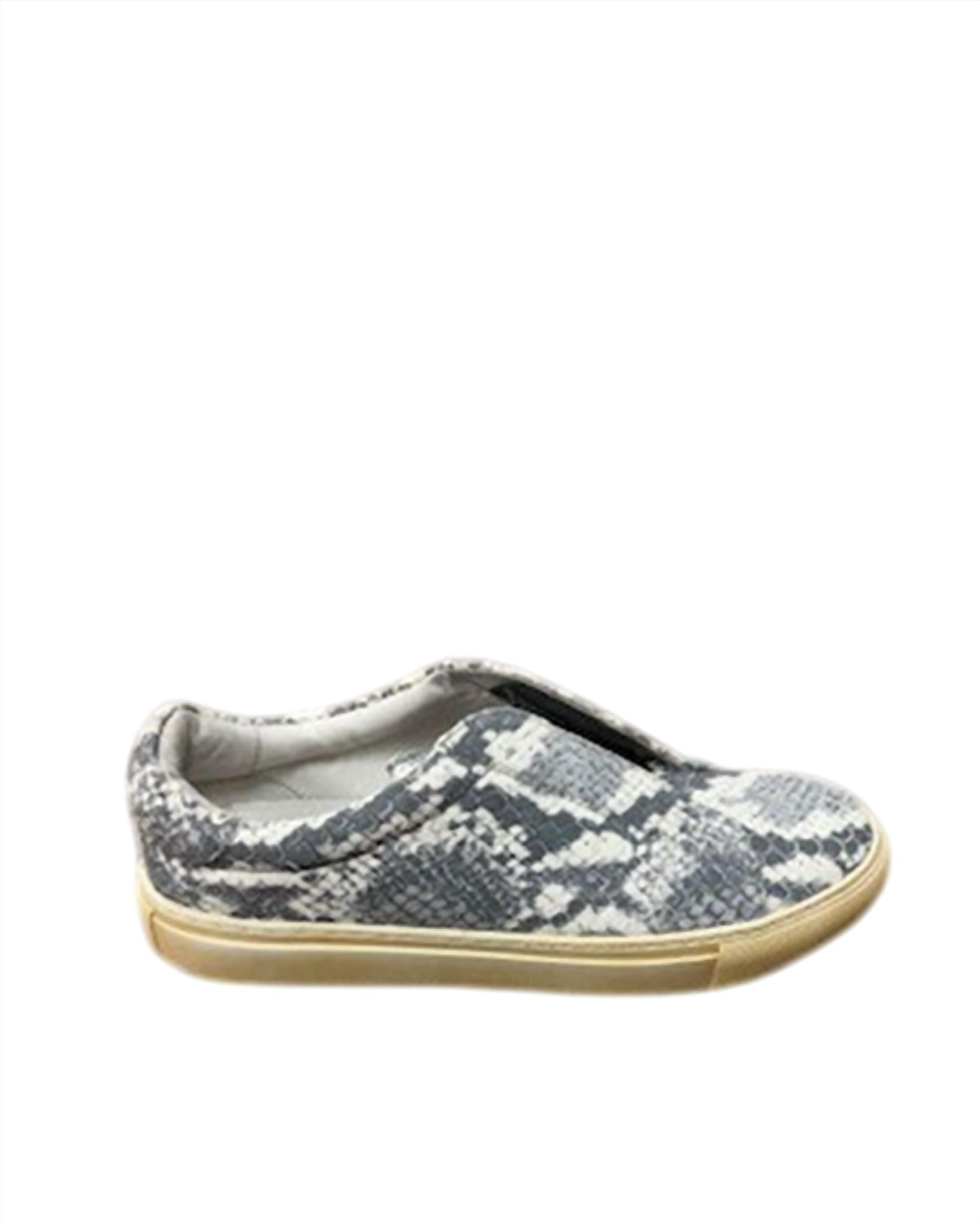 A preppy yet feminine take on the classic loafer. Step up your sneaker game with the Women's Nissa Slip-On Shoes by CHOCOLAT BLU, a chic and effortless choice for the fashion-forward. With a vintage-treated rubber sole and a comfortable approximately 1" platform, these sneakers offer a stylish lift. Composition: leather upper and leather lining with a cushioned footbed for superior comfort. Featuring an elastic gore on the instep, they ensure easy slip-on convenience without sacrificing style, all wrapped in a distinctive grey embossed snake design.