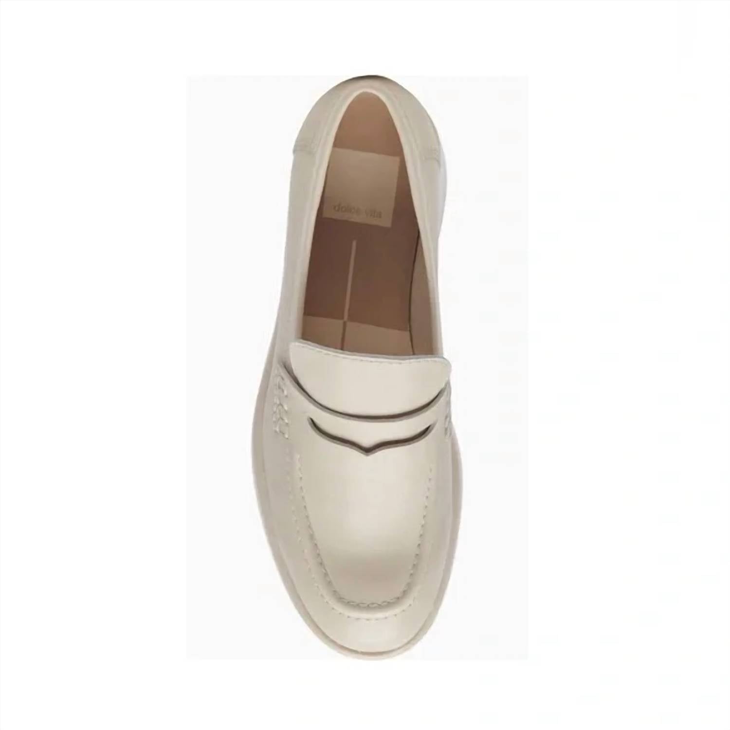 A preppy yet feminine take on the classic loafer. Step into style with the Women's Yanni Platform Leather Penny Loafers by Dolce Vita, perfect for adding a touch of grunge to your fall travel wardrobe. Crafted from smooth leather with a recycled textile lining, these loafers boast a classic round toe, a striking block heel, and a platform sole that measures 4 inches in the heel and 1.25 inches in the platform. These loafers are designed in a sophisticated cream shade, making them a versatile choice for various outfits and occasions. Indulge in high-fashion elegance without sacrificing comfort in these statement-making penny loafers.