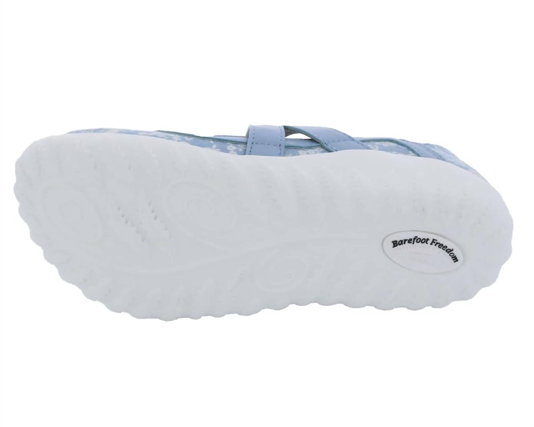 A preppy yet feminine take on the classic loafer. Step into comfort with the Women's Rainbow Mary Jane Shoe by DREW, featuring a charming Blue Flower canvas design. This shoe offers an adjustable closure and a removable footbed with extra padding in the heel for a truly customized fit. The doeskin fabric lining, combined with an ultra-lightweight sole and tempered steel shank, make this flat heel ideal for all-day wear. With the ability to accommodate prescribed orthotics, it's perfect for a personalized touch.