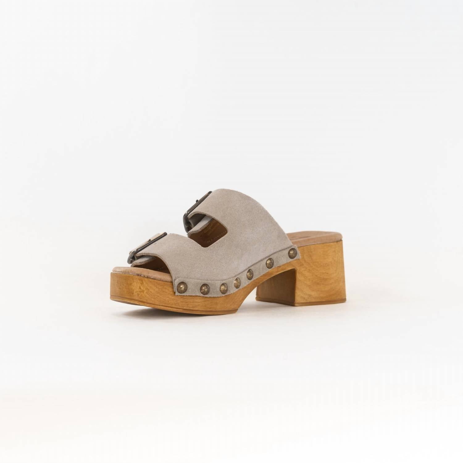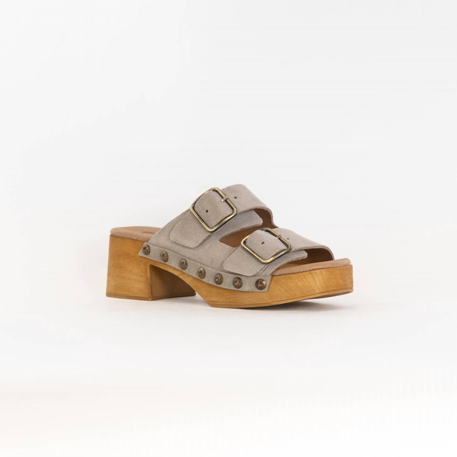 Classicly cute and all-day-wearable. We love this sandal.Open-toed mules. Two wide straps. Large square buckle. Soft straps. Chunky wooden sole. Bock heel, also made of wood.