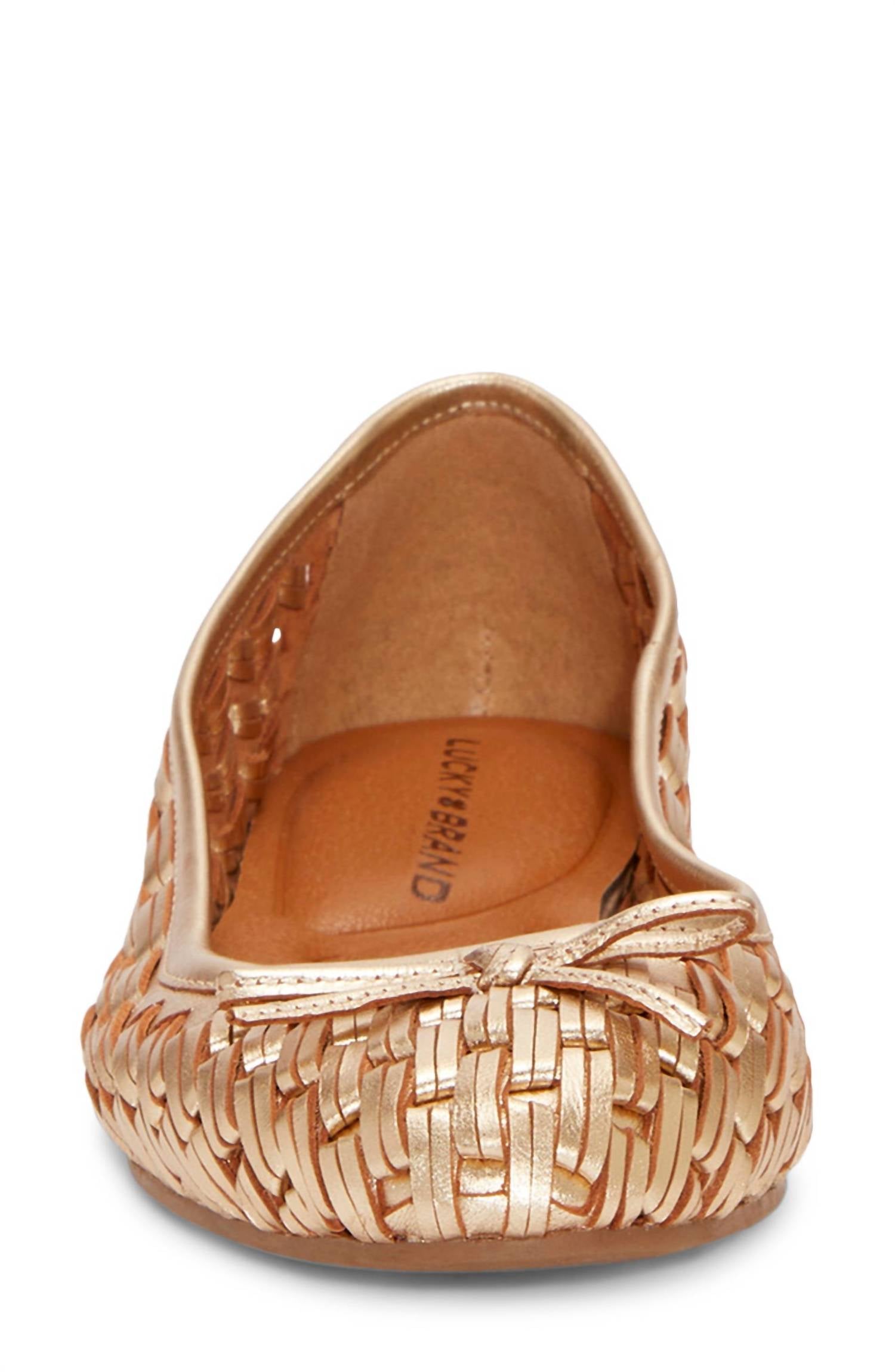 A classic loafer that is both comfortable and polished. Step out in style with Lucky Brand's Mogeni Flats, featuring a captivating Platino Metallic color for the perfect touch of glamour. Crafted with a woven leather upper and leather lining, these flats promise both visual intrigue and all-day comfort. The design is grounded with a cushioned footbed and a durable rubber sole, perfect for women seeking both style and practicality. These flats also boast a classic vamp bow and a round toe, offering a timeless look that aligns with its flat heel height of under 1 inch.