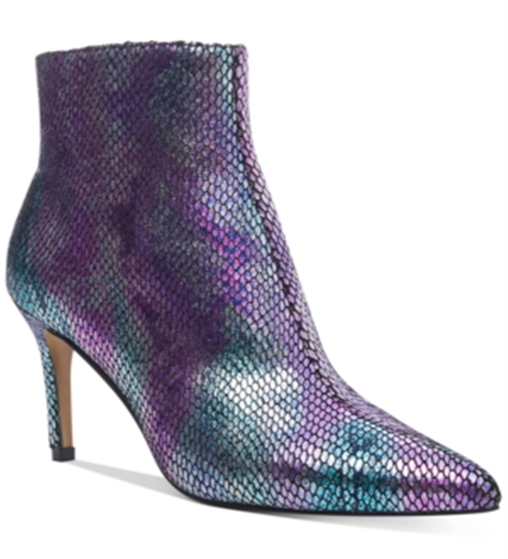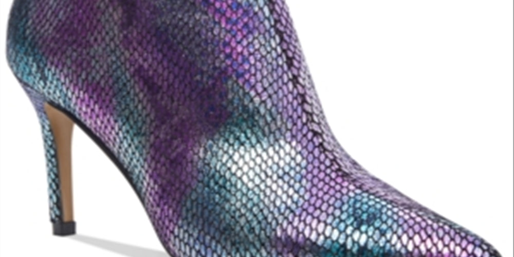Iridescent shimmer and snake-embossed texture bring magical effect to dressy looks in Betsey Johnson's Albaa stiletto booties.| 3-1/4 stiletto heel| Pointed-toe booties with inner ankle zipper closure| Fabric upper; manmade sole| Imported