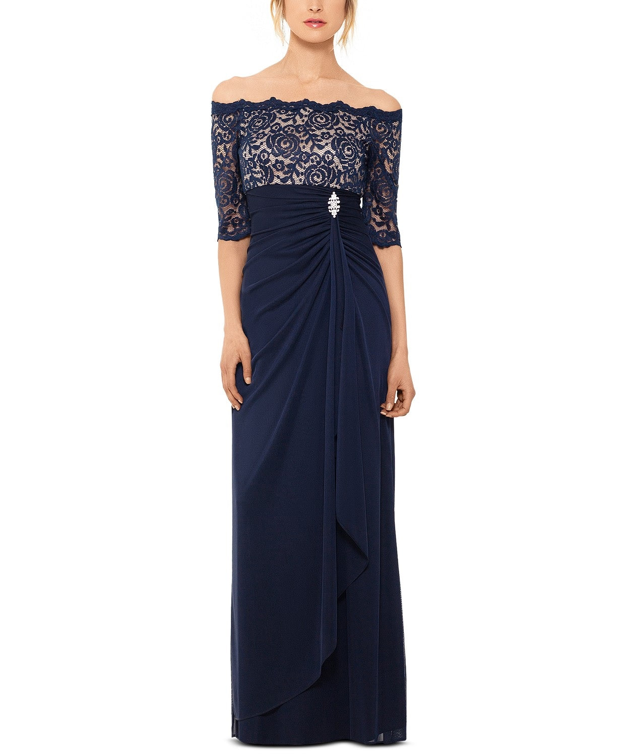 Betsy & Adam Women's Off-The-Shoulder Lace Gown Dark Blue Size 4