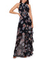Metallic flecks add shimmery flickers to the polished floral print of XSCAPE's halter gown. With ruffles around the armholes and down the front| this gown wows at a wedding or formal event.| Approx. 61-1/2 long from center back neck to hem. Length is based on size 4 and varies 1/4 between sizes| Floor-length formal dress| Halter neckline; Gown silhouette| Zipper closure at center back| Ruffled trim around cutaway arm openings