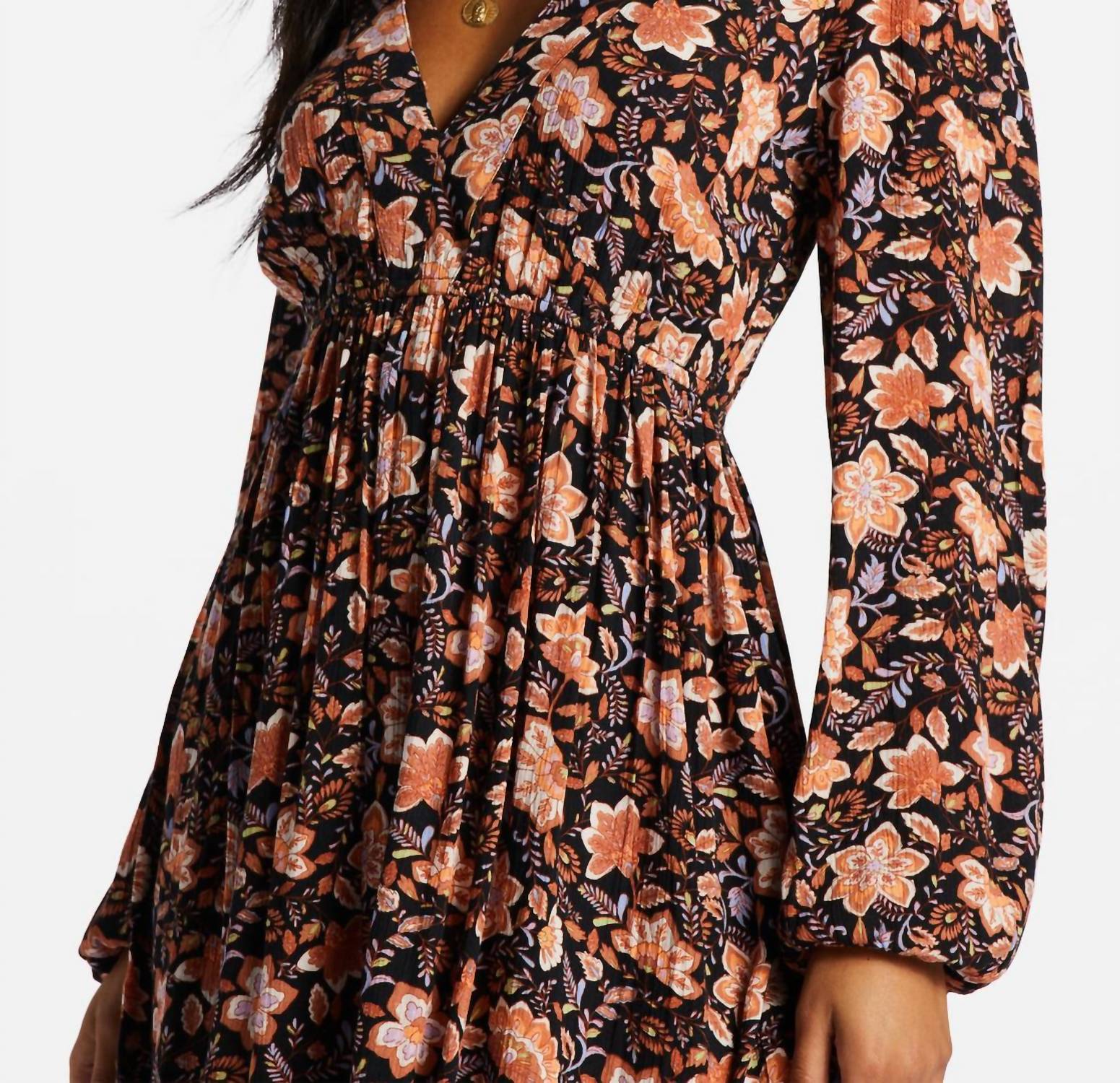 Step into elegance with the Sweetest Dream Dress by Billabong, a stunning addition to any wardrobe. This floral mini dress features long puff sleeves and a deep V-neck, creating a flattering silhouette with its fitted bodice and easy skirt. Crafted from a 100% crinkle viscose blend fabric, this piece showcases a charming metal branding plate and bind panel at the neckline. Perfect for spring occasions, this black pebble empire waist dress captures the essence of 90s fashion.
