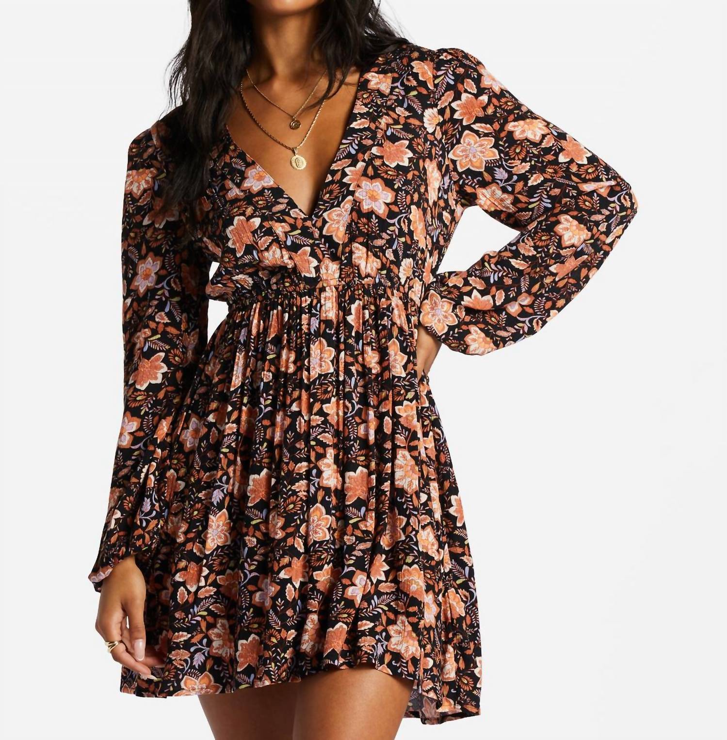 The perfect mini dress for those warmer months. Step into elegance with the Sweetest Dream Dress by Billabong, a stunning addition to any wardrobe. This floral mini dress features long puff sleeves and a deep V-neck, creating a flattering silhouette with its fitted bodice and easy skirt. Crafted from a 100% crinkle viscose blend fabric, this piece showcases a charming metal branding plate and bind panel at the neckline. Perfect for spring occasions, this black pebble empire waist dress captures the essence of 90s fashion.
