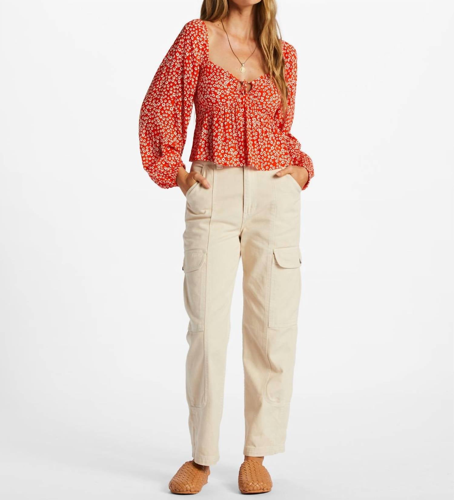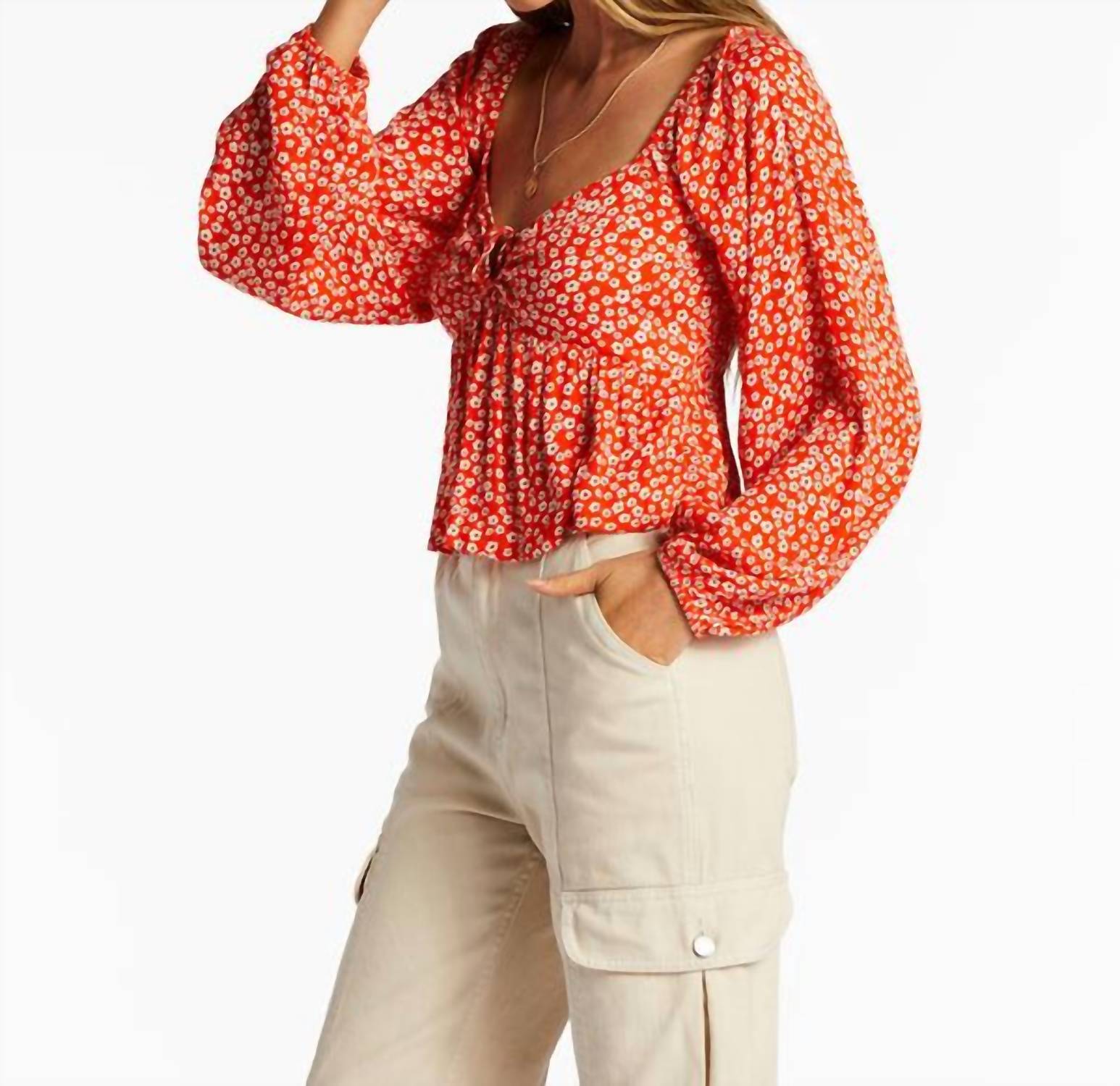 Pair this with your favorite jeans and slides for your next girls night out. The Your Fav Top by Billabong is an enticing piece perfect for spring gatherings, presented in a vibrant Fire Side floral pattern. This blouse features long blouson sleeves and a figure-flattering peplum ruffle at the waist, complete with a keyhole at the bust. Crafted from a crinkle viscose blend, it offers a V-neckline and a smocked back, finished with a tie closure for a custom fit. Materials: 100% Viscose. Ideal for Thanksgiving or housewarming occasions, this top is a nod to 90s fashion trends.