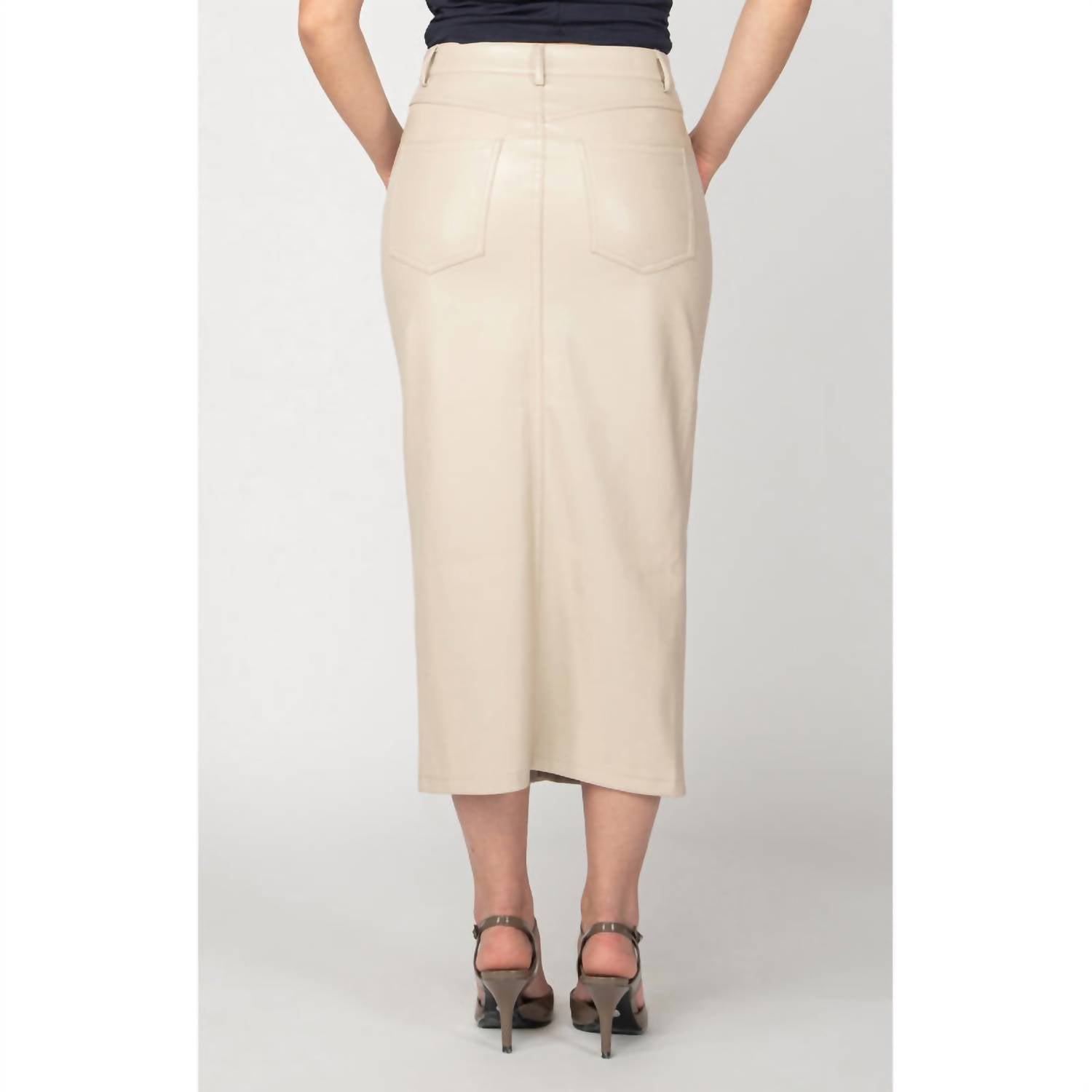 Show off just the right amount of skin in this beautifuly designed midi length skirt. Elevate your wardrobe with the Faux Leather Midi Skirt by Black Tape in a chic bone color. Crafted from premium faux leather, this skirt offers a sleek and versatile design that suits any body type, perfectly adding an edgy touch to your ensemble. Featuring practical pockets and a secure button closure, this piece is an essential for the modern woman. Ideal for a range of occasions, it seamlessly combines style with functionality.