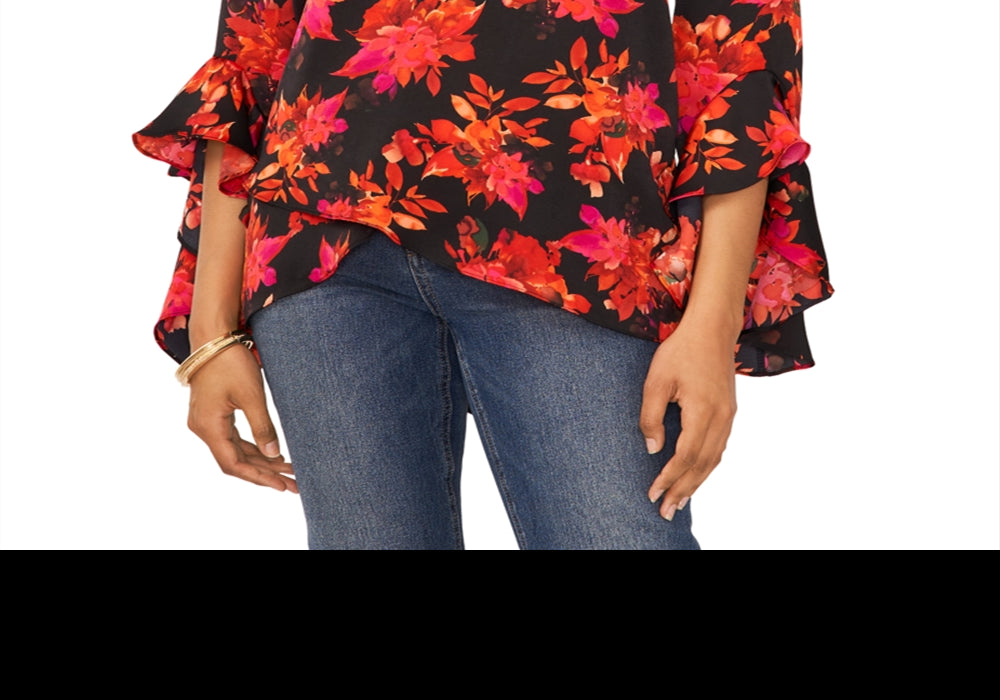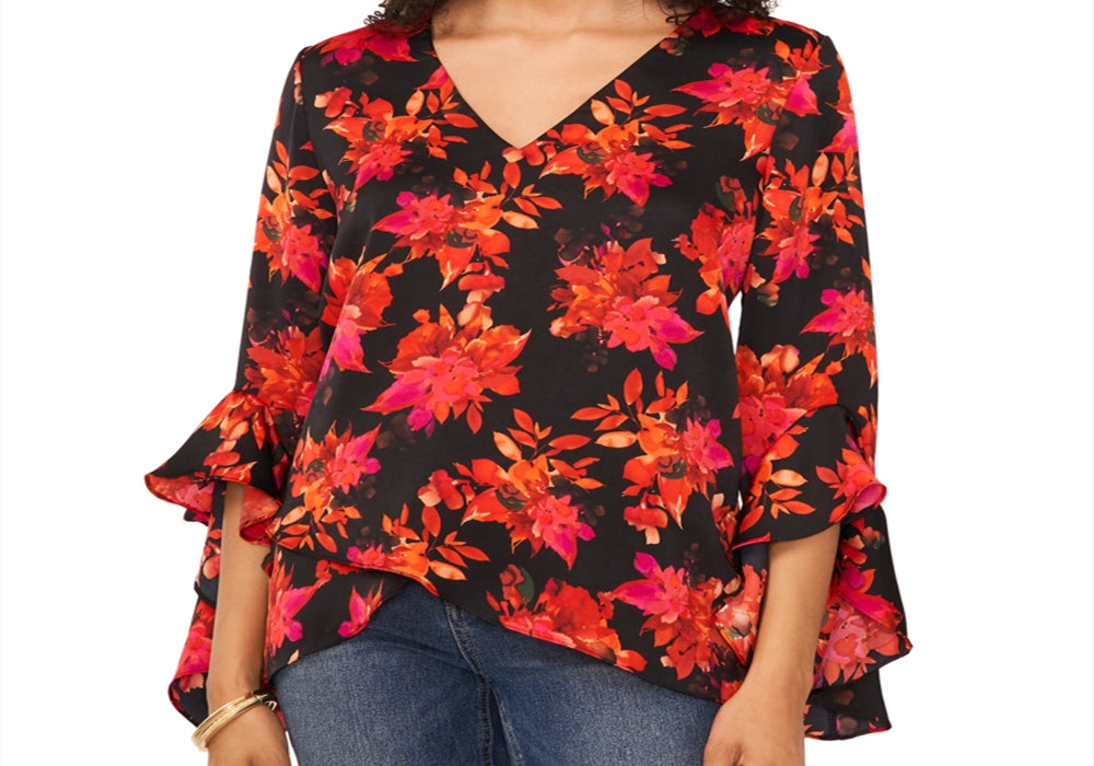 Vince Camuto Printed V Neck Layered Hem Top Black