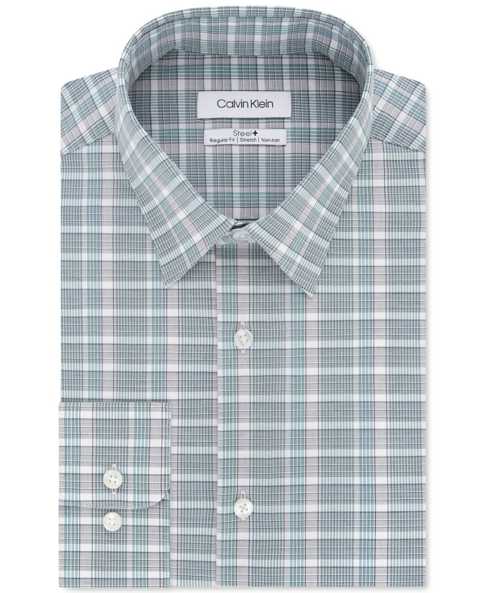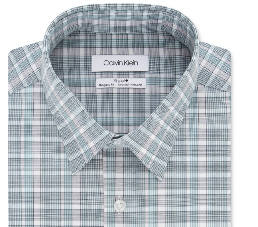Calvin Klein Men;s Green Plaid Collared Classic Fit Moisture Wicking Dress Shirt Green Size 17.5-36/37