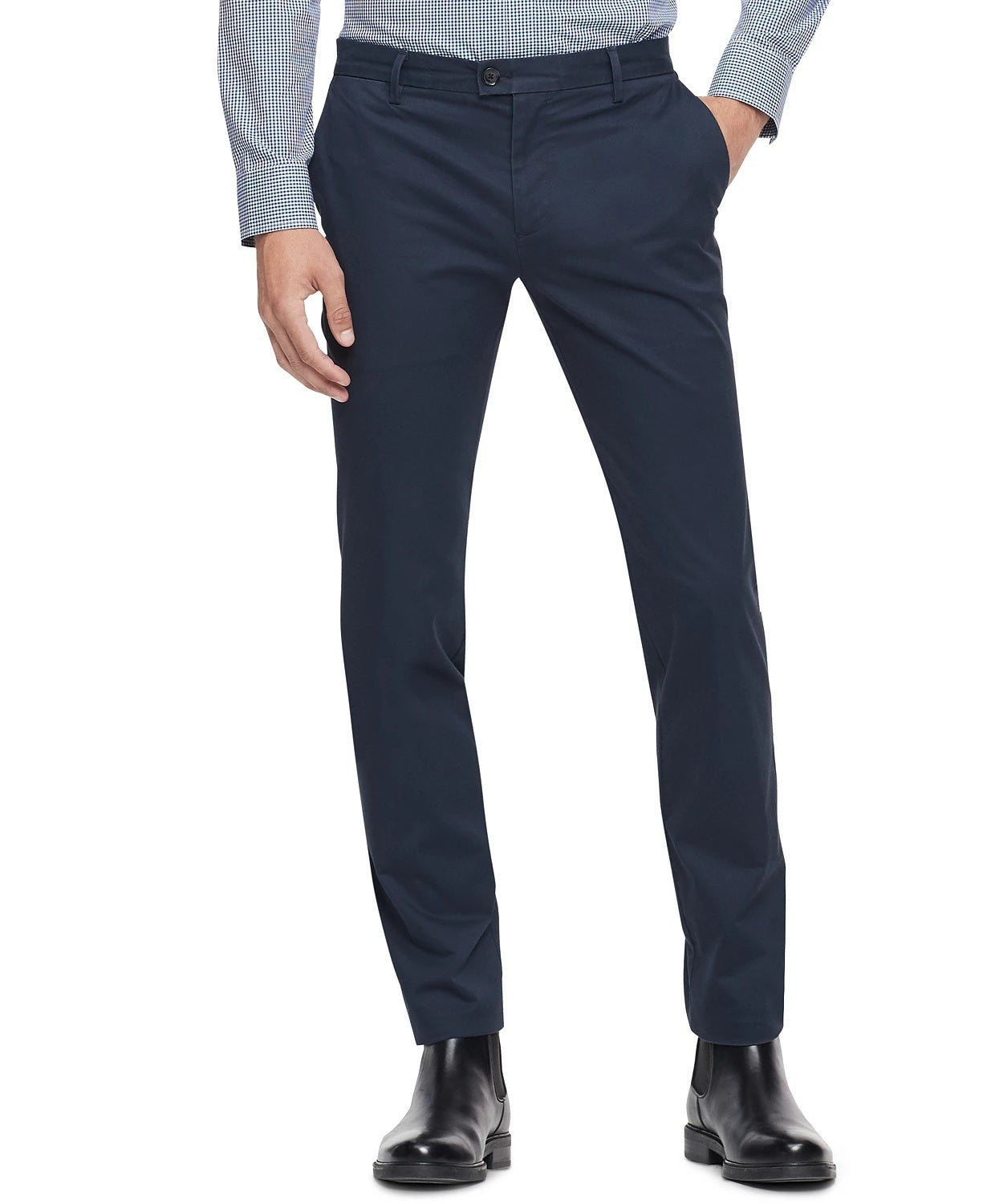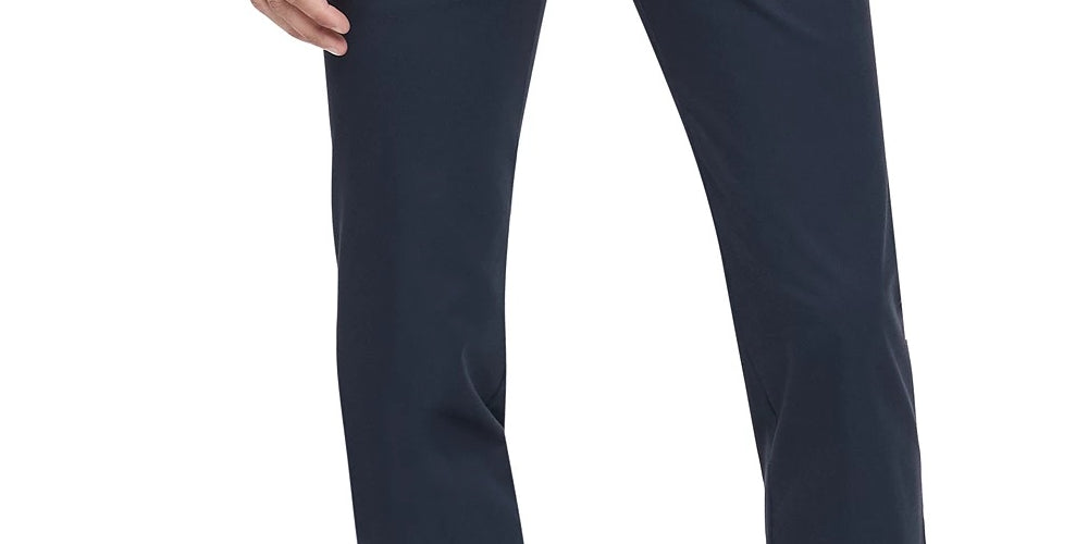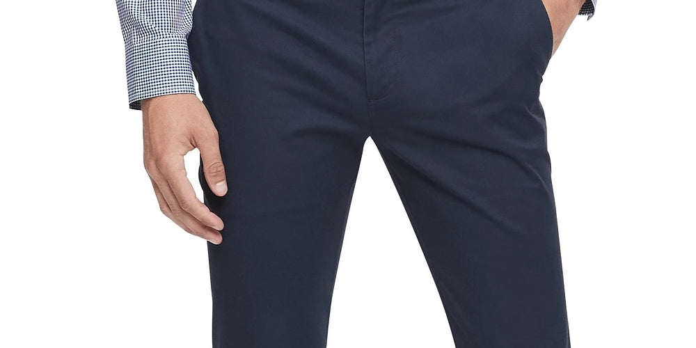 Slim fit stretch chinos|Flat front; Finished hem; No cuff|Zip fly with button closure; Belt loops|Two side slant pockets; Two back welt pockets|Approx. measurements: (Front rise: 8-3/4"; Back rise: 14"; Leg opening: 15")