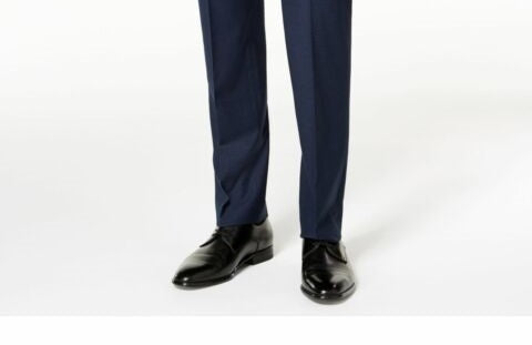 Slim fit pants sit slightly below the waist; slim fit through the hips and thighs with a straight or narrow leg opening|Flat front; finished hem; no cuff|Zip fly with button-and-hook closure; belt loops|Two side-seam pockets; two button-through back welt pockets|Permanent crease; mini-grid pattern; stretch performance|Polyester/viscose/elastane|Machine washable
