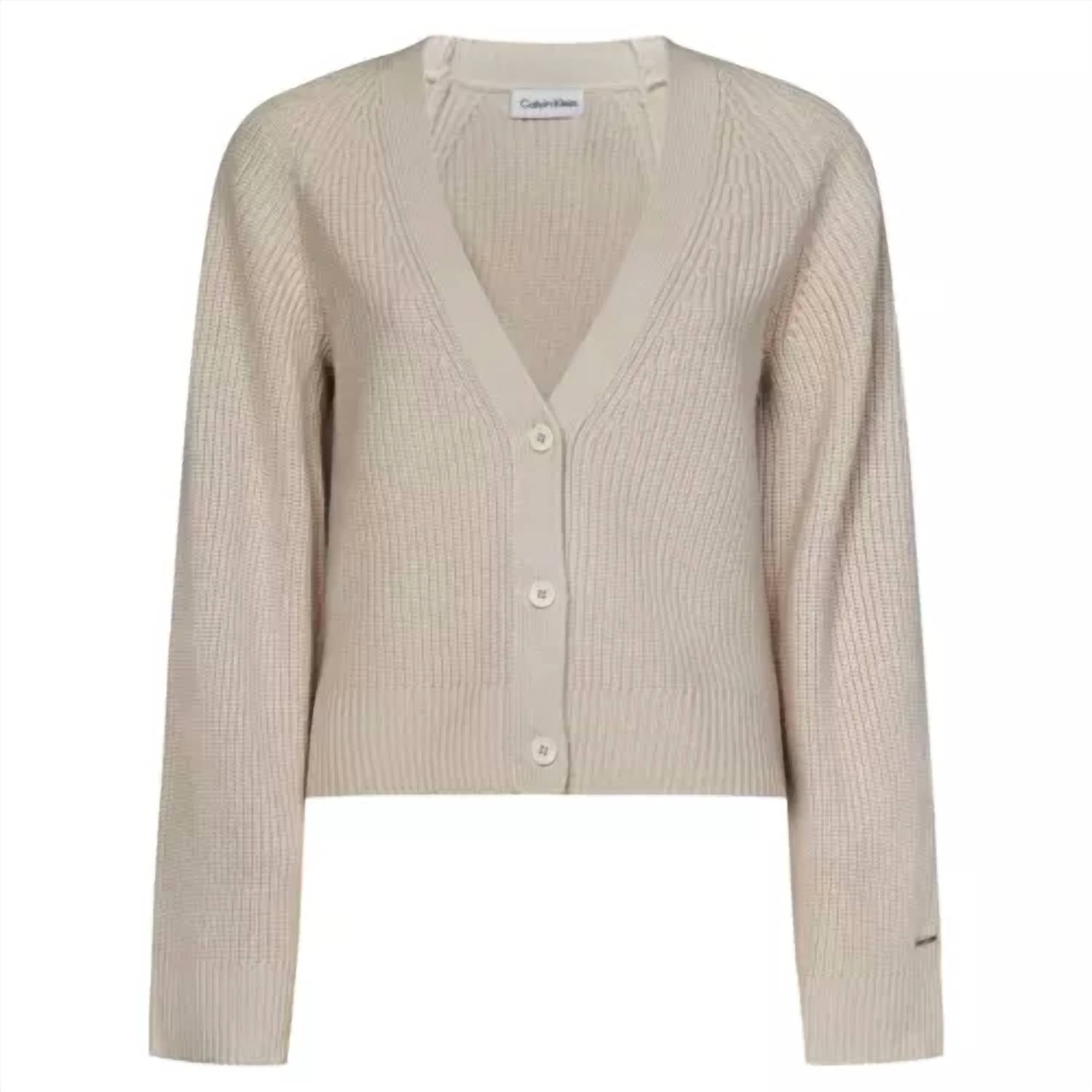 This cardigan will be a sweater-rotation favorite. Introducing the V Neck Cropped Wool Cardigan by Calvin Klein, a chic and timeless piece perfect for layering in cooler weather. This cardigan features long sleeves, a V-neckline, and a button closure, boasting a textured pattern in a sophisticated beige hue. Crafted from 100% virgin wool and measuring a flat underarm width of 16" with a garment length of 20.5", it combines style with a feminine fit. Care for this elegant staple with a gentle hand wash to maintain its quality.