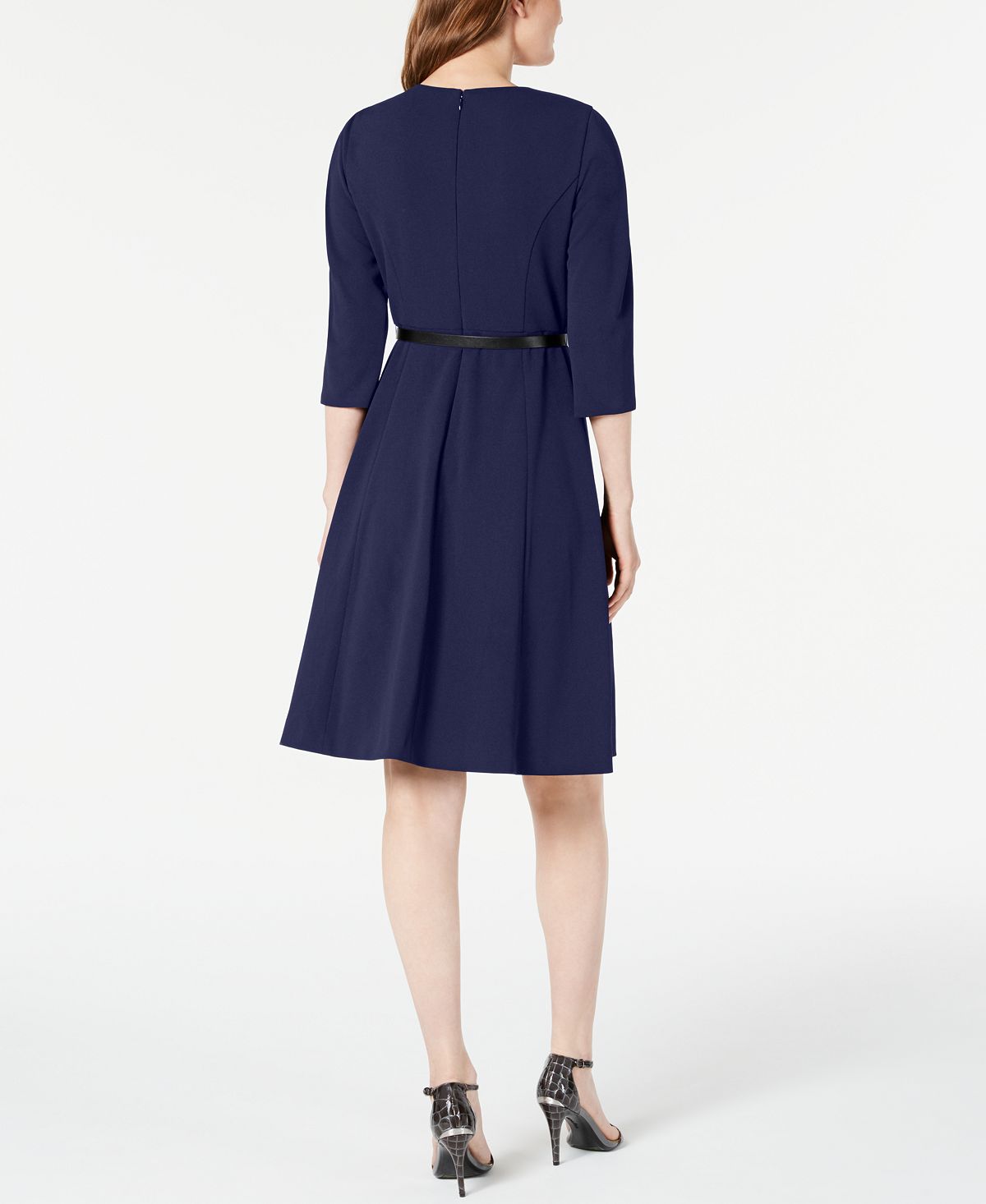 Calvin Klein reinvents this petite A-line dress with pleated 3/4-sleeves and a sleek faux-leather belt.| Approx. 36-1/2 long from center back neck to hem. Length is based on size 4P and varies 1/4 between sizes| Designed to fit and flatter 5'4 and under frame| Crewneck; A-line silhouette| Hidden back zipper closure| Pleated 3/4-sleeves| Removable faux-leather belt with logo hardware