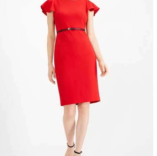 Calvin Klein Women's Belted Ruffle Sleeve Sheath Dress Red Size 8