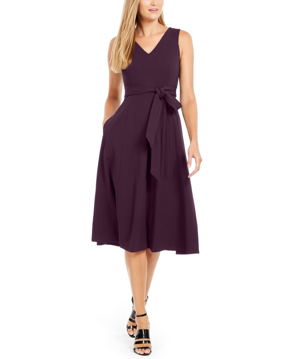 Approx. 44 1/2" long from center back neck to hem. Length is based on size 6 and varies 1/4" between sizes|V-neck; A-line silhouette|Hidden zipper closure at center back|Tie belt at waist|Unlined