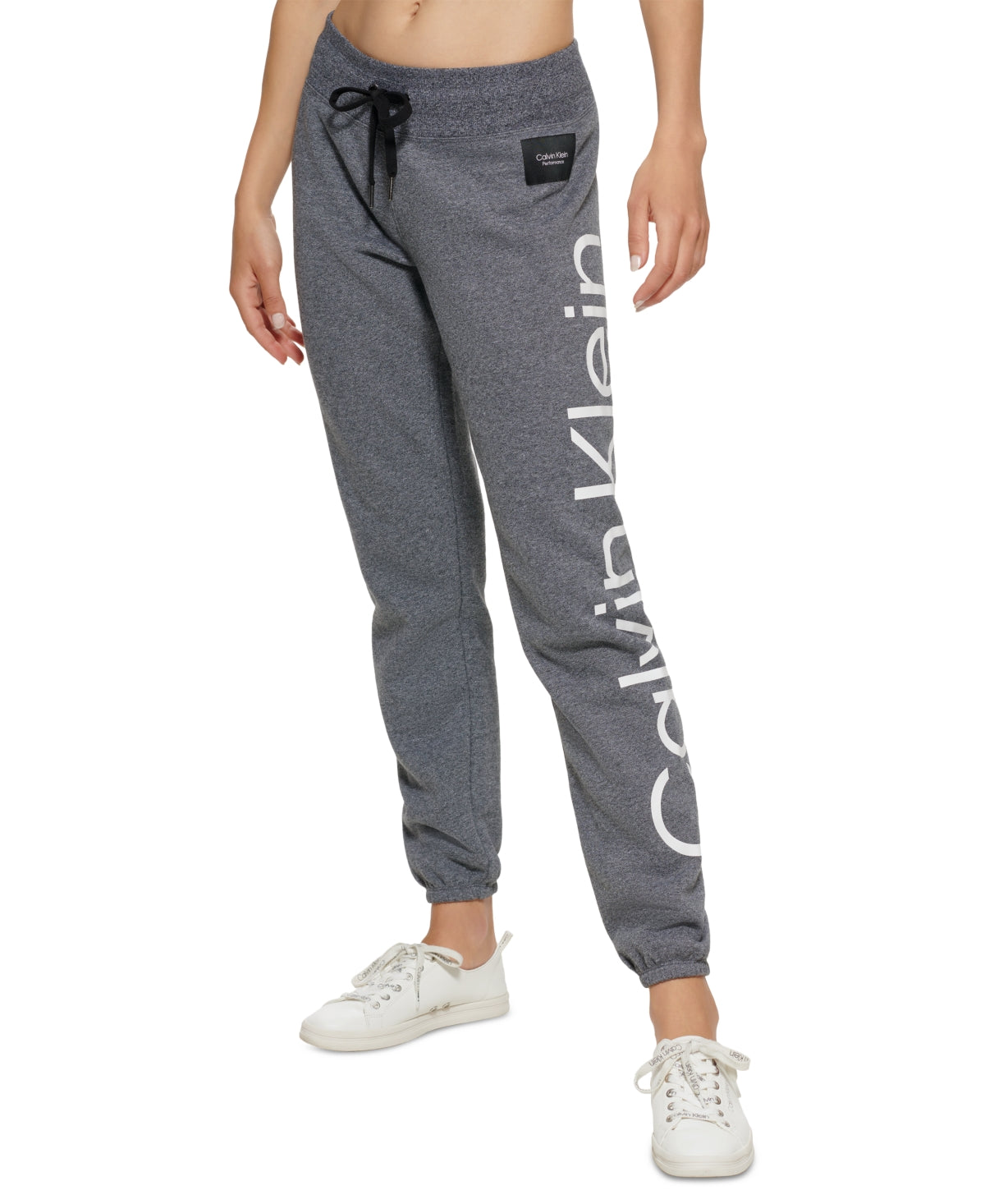 An unmistakably stylish athleisure look| these jumbo-logo slim-leg joggers from Calvin Klein keep you comfortable in cozy fleece.| Mid rise; approx. 9-3/4; approx. inseam; 30; cuffed leg opening; 9| Pull-on style; ribbed waistband with drawcord; jumbo logo at leg; elastic cuffs| Cotton/polyester (40% recycled)| Machine washable| Imported