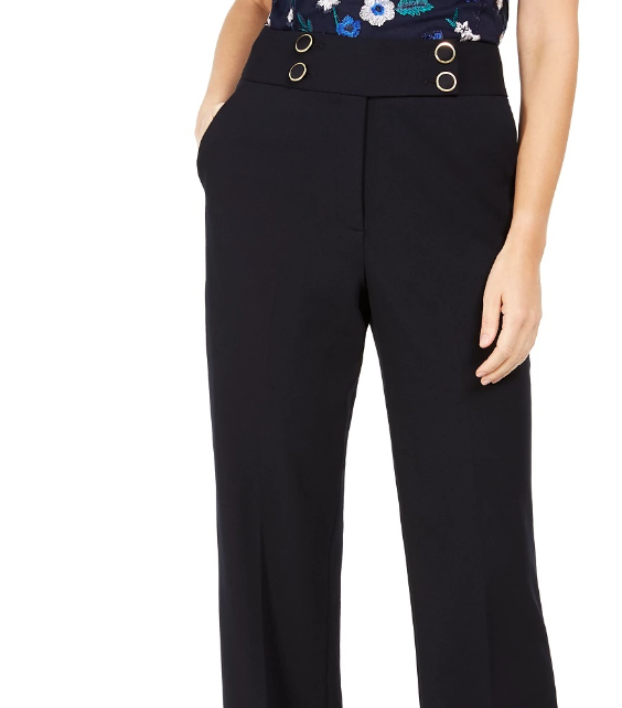 Approx. inseam: 30-1/2"|High rise; straight fit through hips and thighs; straight leg|Designed to fit and flatter 5'4" and under frame|Front zipper with four-button closure|Hip pockets|Polyester/spandex|Dry clean