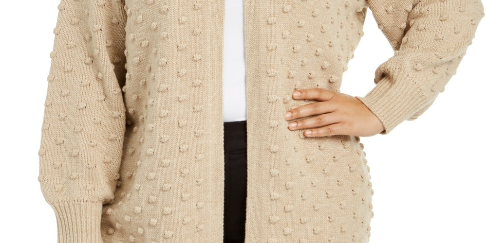 Open front|Popcorn texture at front; smooth knit at back; ribbed front and back yokes; ribbed hemline band|Long volume sleeves with popcorn texture and ribbed cuffs|Acrylic/nylon|Hand wash