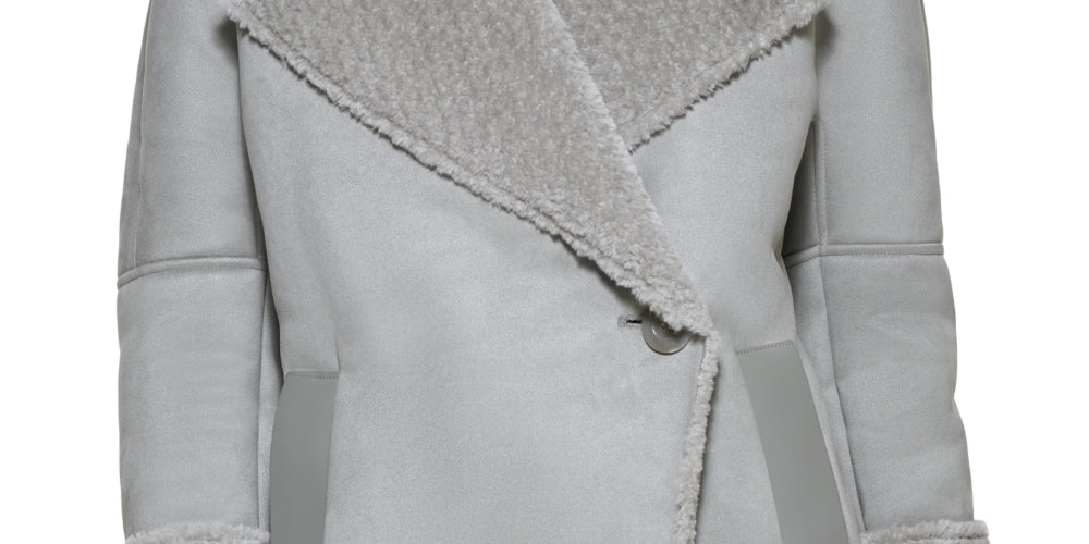 Calvin Klein Women's Pocketed Faux Leather Faux Shearling Collared Button Down Winter Jacket Coat Gray Size X-Small
