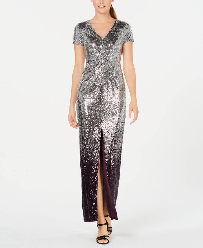 V-neck; Gown silhouette| Back zipper closure| Sequins; ombré at hemline; piping at neck & sleeve edge; center front slit for leg