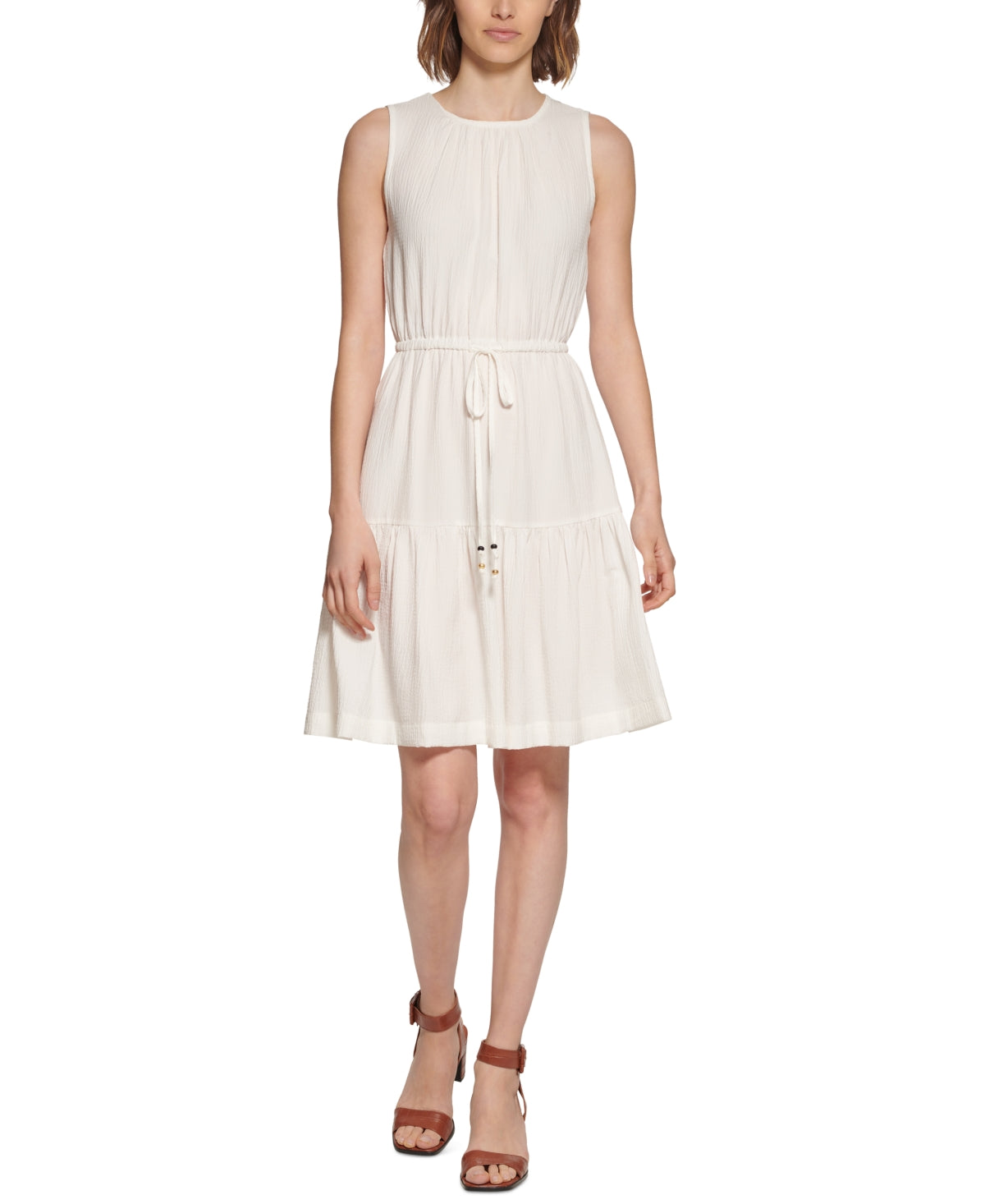 Looking your best is a cinch in Calvin Klein's fit & flare dress| featuring a drawstring waist.| Approx. 37-1/4 long from center back neck to hem. Length is based on size 6| Fitted through the chest and waist; flared and flowing skirt| Round neckline; Fit & flare silhouette| Back keyhole with button closure| Drawstring waist; tiered hem