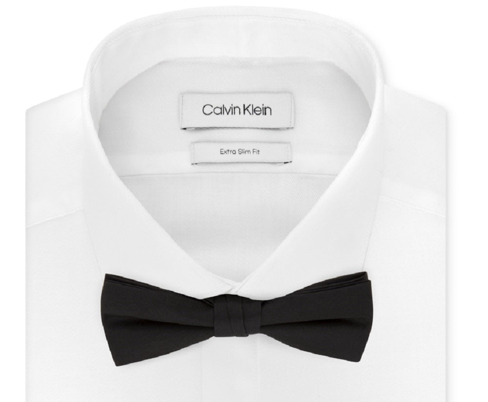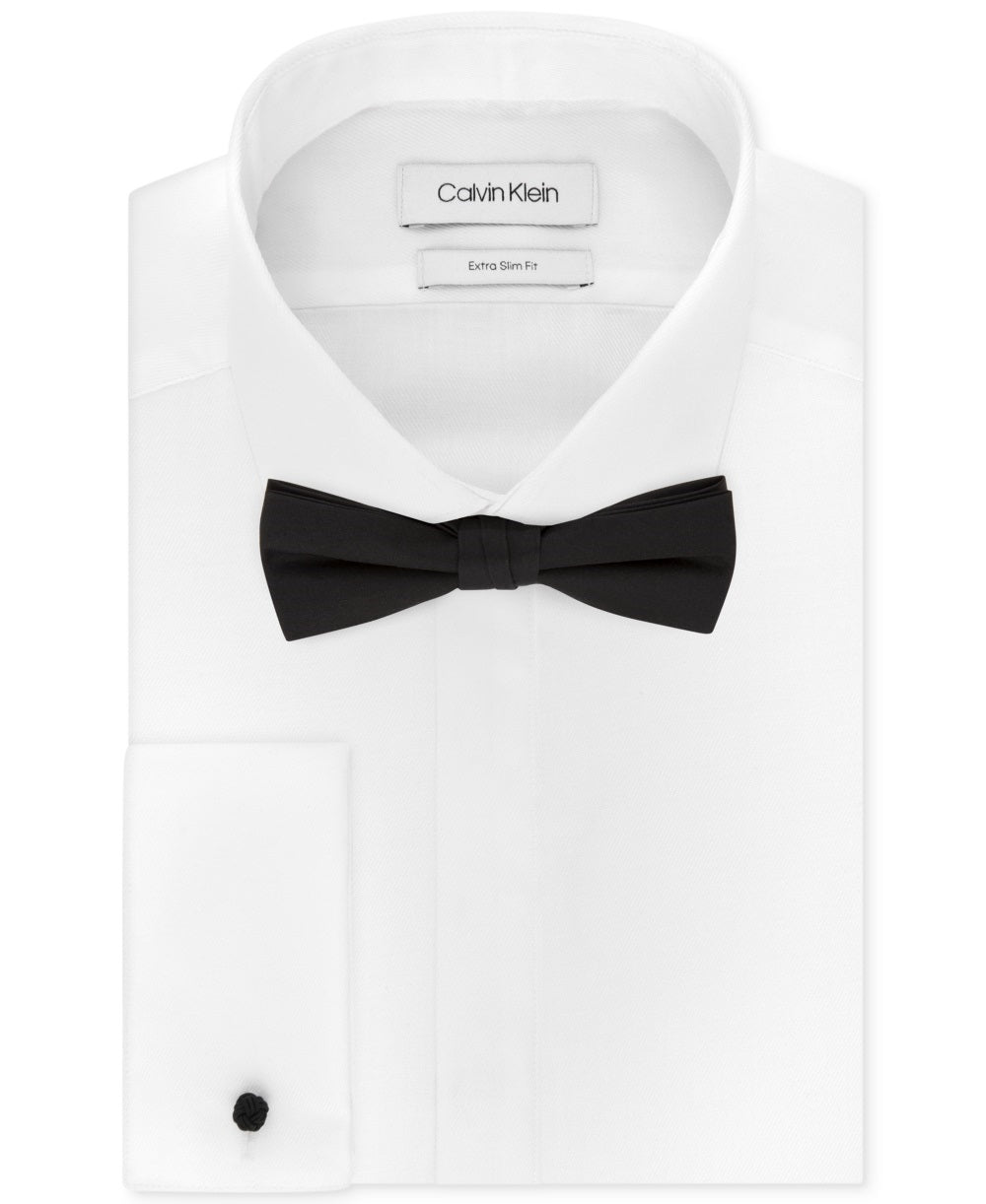 An extra-slim fit is cut close through the chest, sleeves and waist for the slimmest fit; features slim armholes and sleeves|Spread collar|French cuffs|Includes pre-tied solid bow tie|Cotton/elastane (shirt); Polyester/silk bow tie|Machine washable
