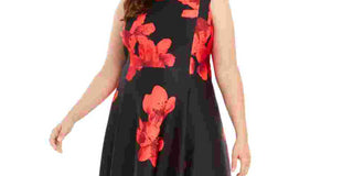 Calvin Klein Women's Zippered Floral Sleeveless Jewel Neck Midi Fit + Flare Party Dress Red Size 14W