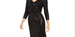 Calvin Klein Women's Sequined Cut Out 3/4 Sleeve V Neck Full Length Blouson Formal Dress Black Size 10