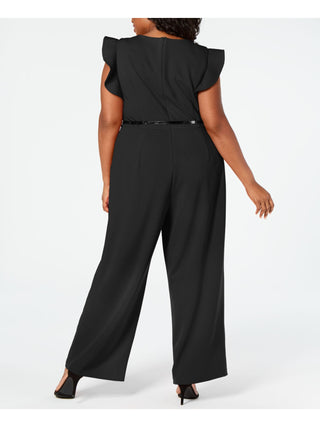 Calvin Klein Women's Belted Ruffled Zippered Sleeveless Jewel Neck Wide Leg Party Jumpsuit Black Size 14W